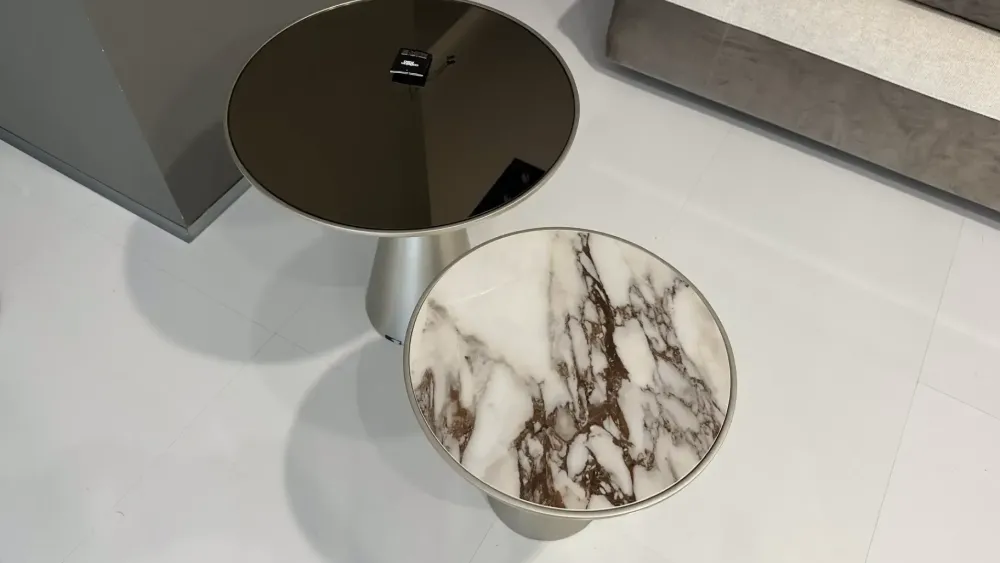 Coppia di tavolini Cattelan modello Peyote finitura titanio con piani in ceramica e specchio.