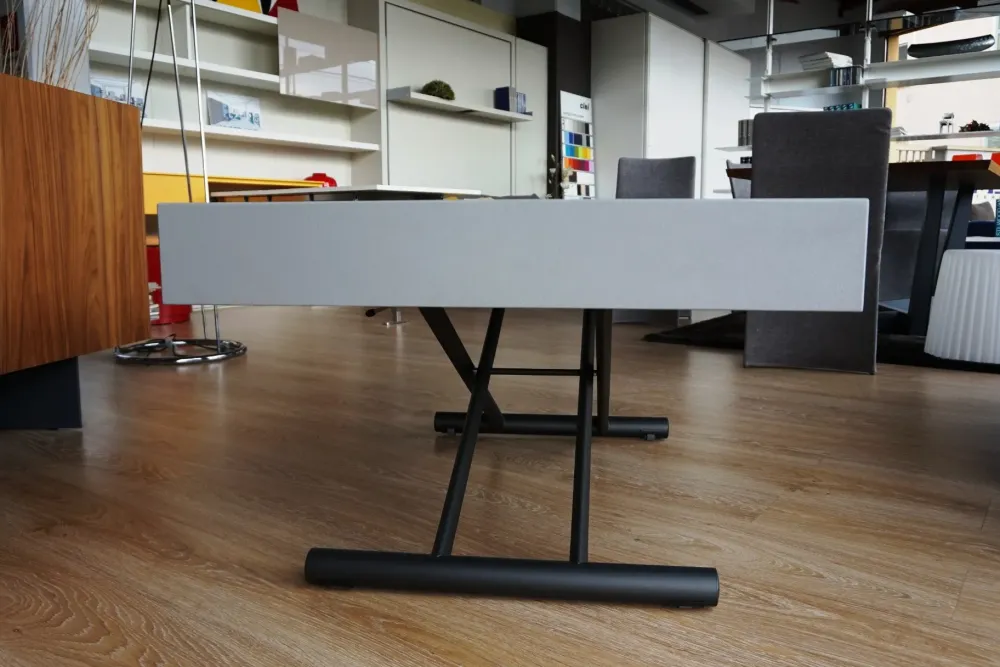 Tavolino 80×120 cm trasformabile in tavolo da pranzo con meccanismo a gas regolabile in altezza al millimetro da 28 cm a 88 cm. Dotato di due prolunghe interne che consentono di allungarlo a 170 cm (1 prolunga) o 220 cm (2 prolunghe). Struttura: goffrato grigio Piano: malta beton grigio effetto pietra IN PRONTA CONSEGNA CONSEGNA A MILANO GRATUITA Vieni a scoprirlo in showroom! Ulisse è disponibile in differenti finiture con piano in ceramica, nobilitato, laccato o rovere impiallacciato e base cromo, dorata. Prezzo a preventivo.