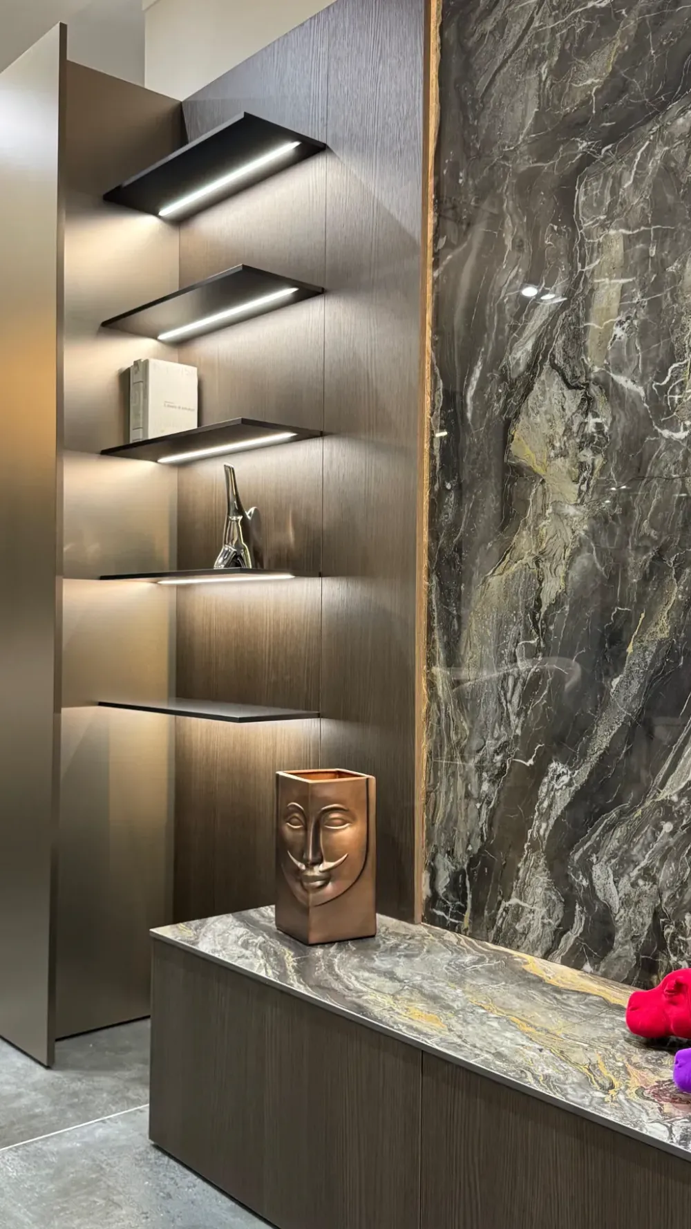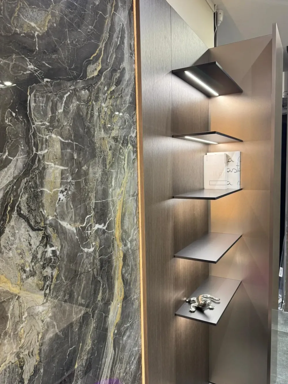 Inoltre sia le mensole che il retro boiserie che l’interno delle colonne sono illuminati da led.