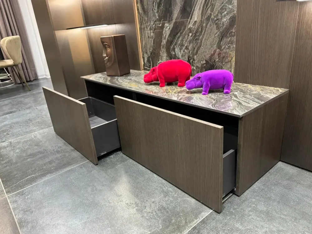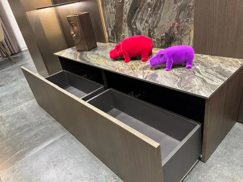 Stupenda parete attrezzata dell’azienda Binova, con colonne laterali in finitura Tech Alluminio Campagne con anta sporgente per consentire l’apertura, mentre le basi cestoni centrali ed il pannello boiserie sono stati realizzati in finitura rovere quercia.
