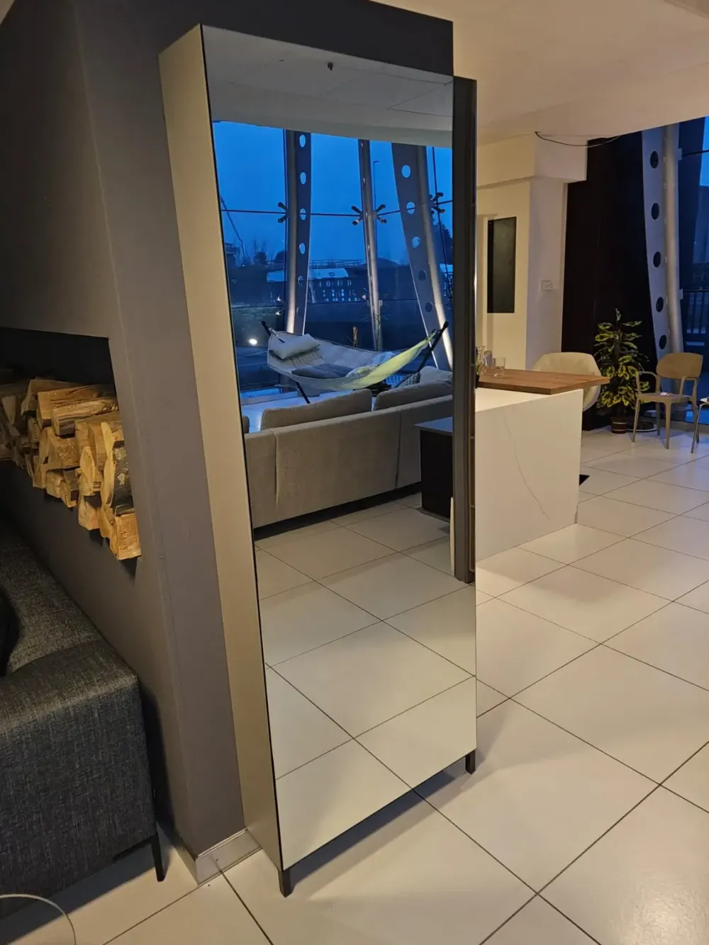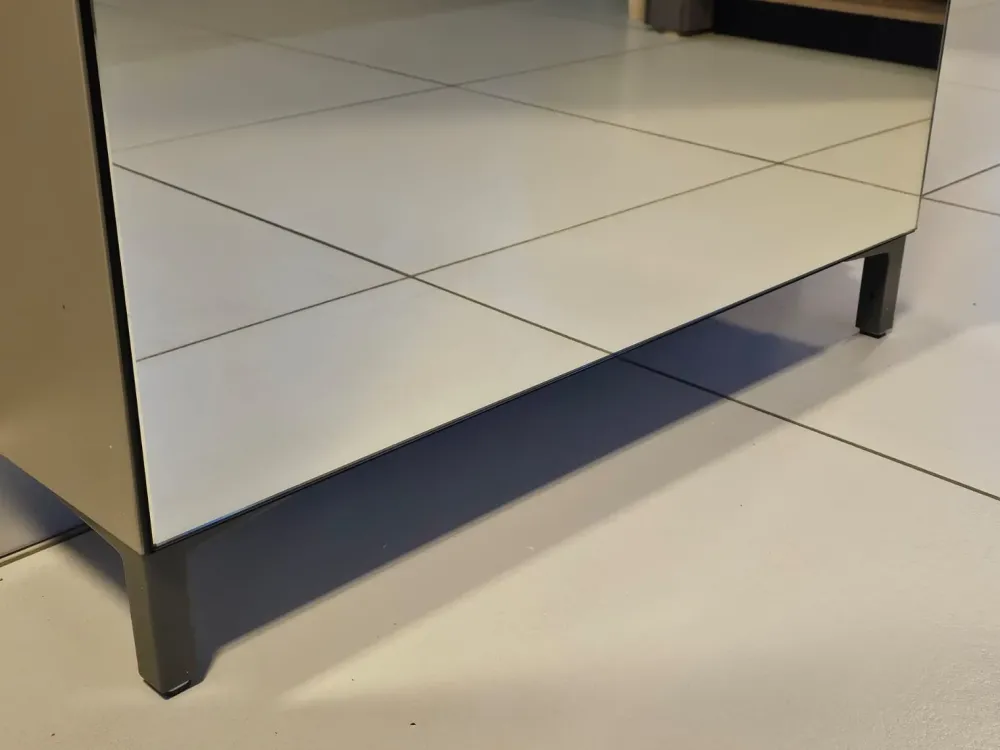 Scarpiera Welcome Birex, dotata di 1 anta Sx con specchio naturale, struttura nobilitato avana, completa di ganci appendiabiti e piedini frontali in finitura Titanio.