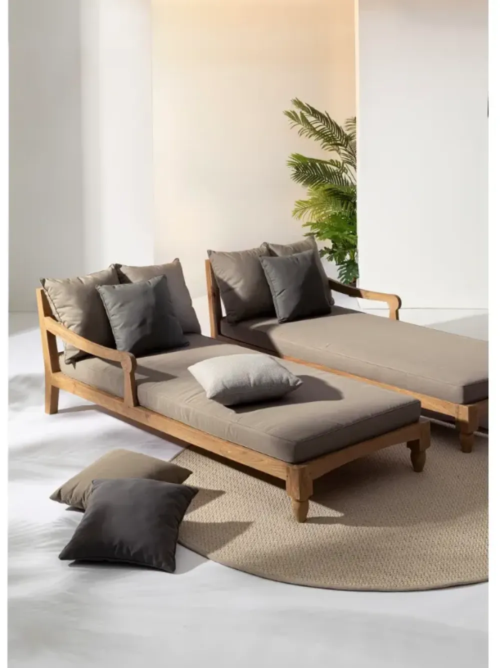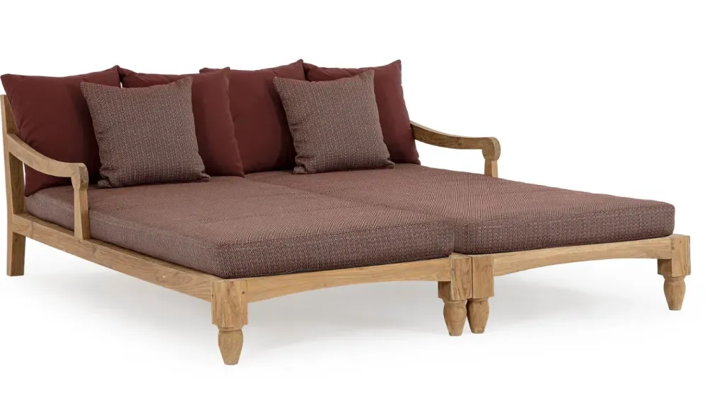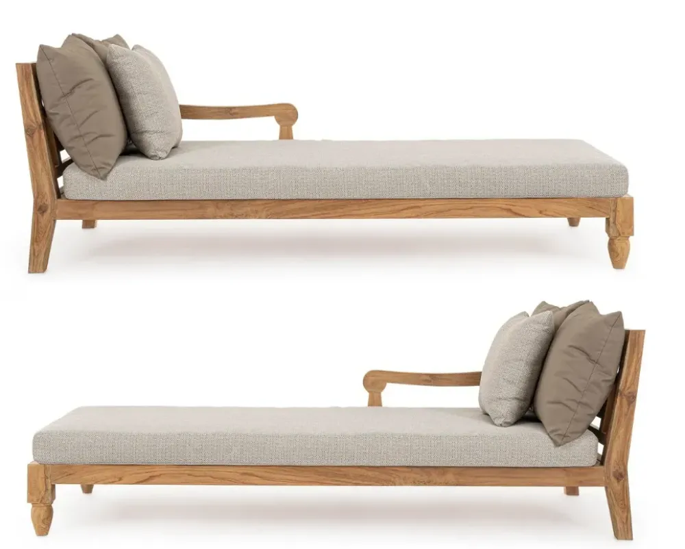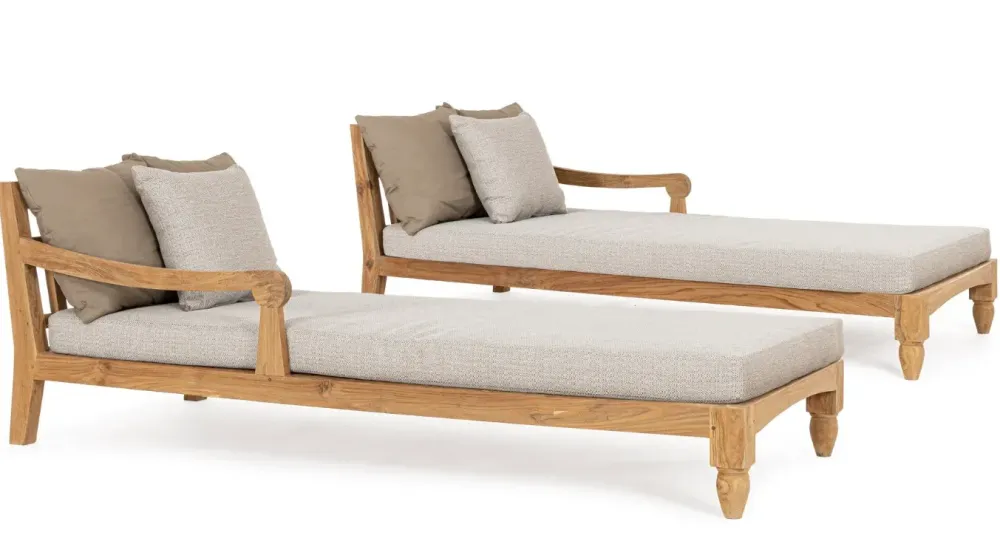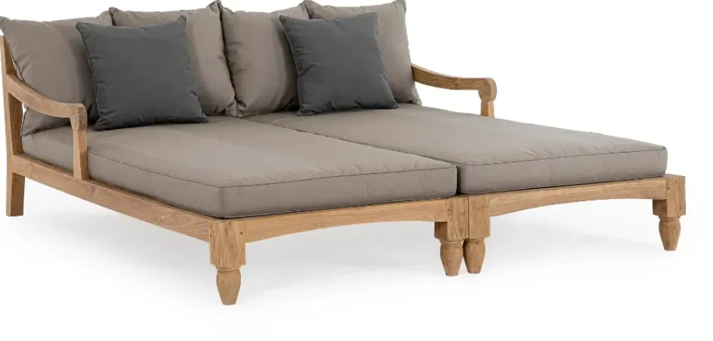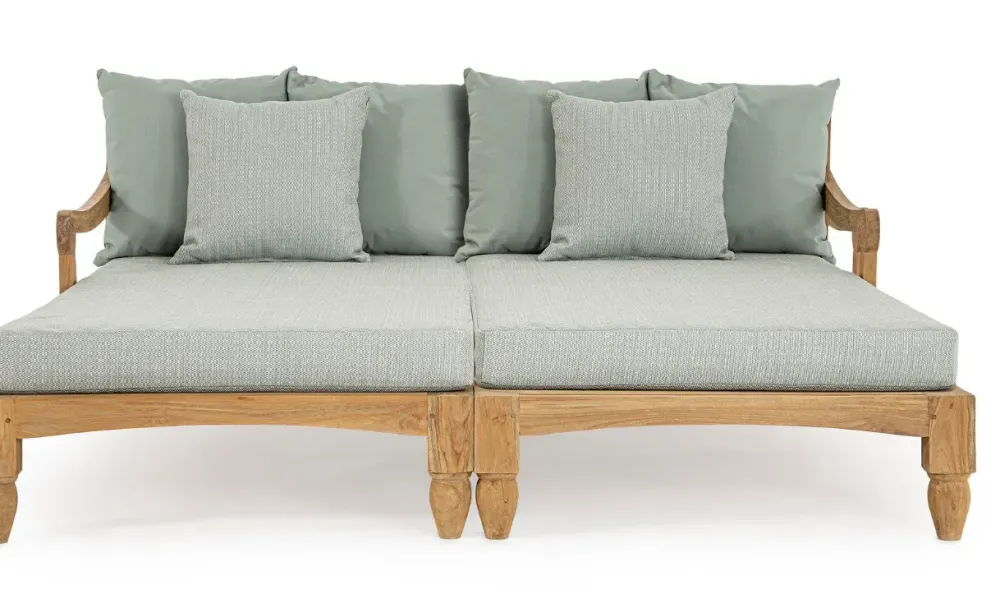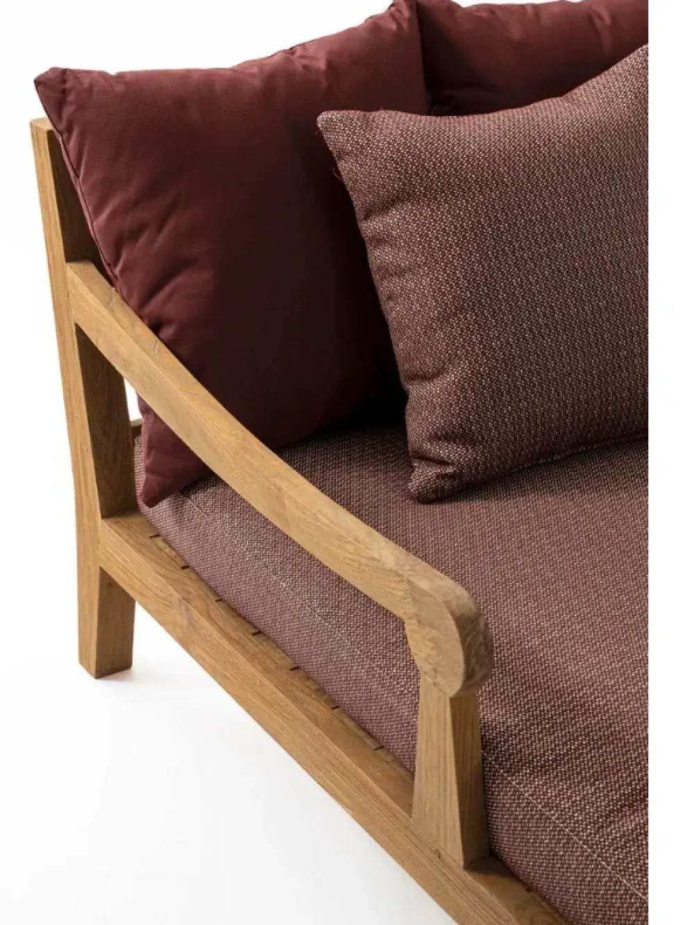 Legno teak 100%, finitura sabbiata ed anticata a base d’acqua. cuscini sfoderabili in tessuto idrorepellente sunproof olefin (100% polipropilene). . eventuali fessure, crepe o imperfezioni, che possono generarsi anche nel corso del tempo, sono caratteristiche di questo materiale e rendono ogni pezzo unico e originale. il teak è un legno ricco di olii. con il passare del tempo, questi olii, per un processo naturale, si consiglia di nutrire il legno con trattamenti stagionali