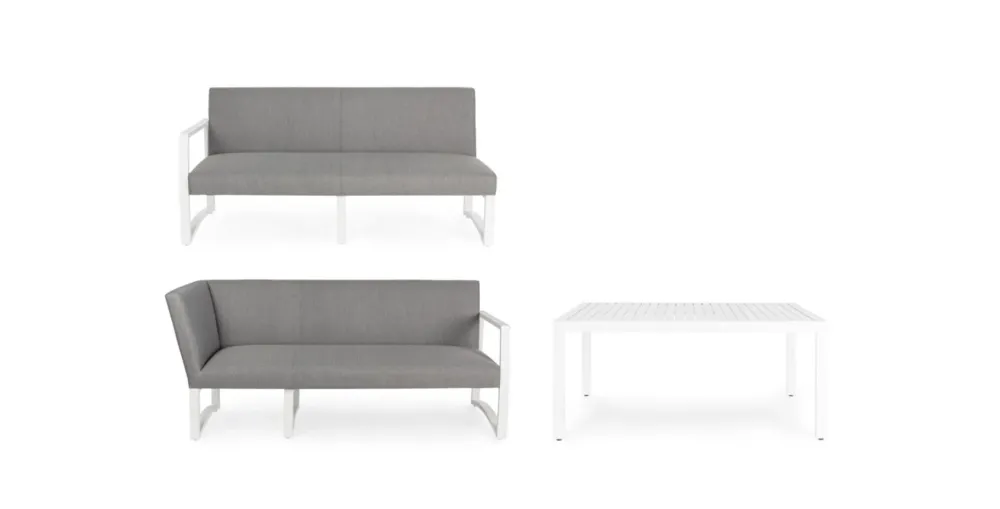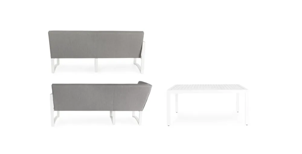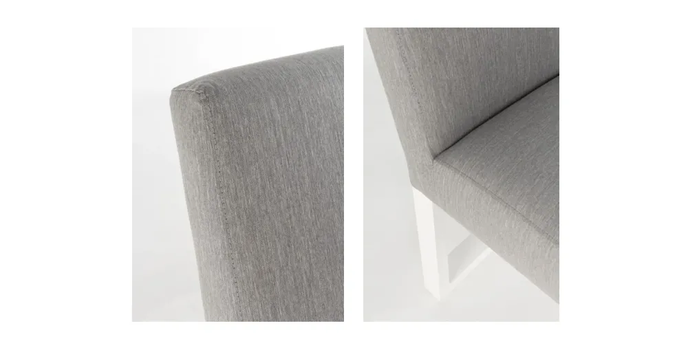 STRUTTURA IN ALLUMINIO, VERNICIATO A POLVERE (POLIESTERE) COLORE BIANCO. SEDUTA E SCHIENALE, NON SFODERABILE, CON TESSUTO PER ESTERNO IN POLIESTERE (250g/m2) IMPERMEABILIZZATO INTERNAMENTE CON RIVESTIMENTO A BASE DI POLIURETANO. COMPLETO DI CUSCINI CON IMBOTTITURA IN SCHIUMA POLIURETANICA SEDUTA (30 kg/m3), SCHIENALE (25kg/m3).