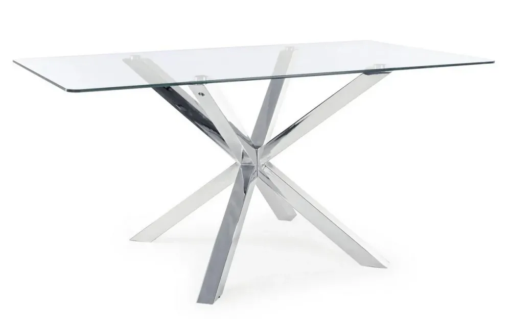 Tavolo in vetro rettangolare con basamento centrale. GAMBE IN ACCIAIO LUCIDO. PIANO IN VETRO TEMPERATO SPESSORE 10MM. GAMBE DA ASSEMBLARE.