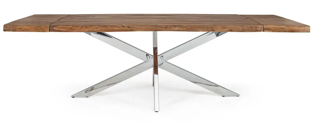 Gambe in acciaio inossidabile, piano in legno d’acacia (sezioni originali di tronco). finitura acrilica protettiva. 2 prolunghe esterne da 40cm. essendo un piano lavorato a mano, le forme e le misure del legno sono solo indicative. tutti i prodotti saranno diversi l’uno dall’altro. gambe da assemblare.