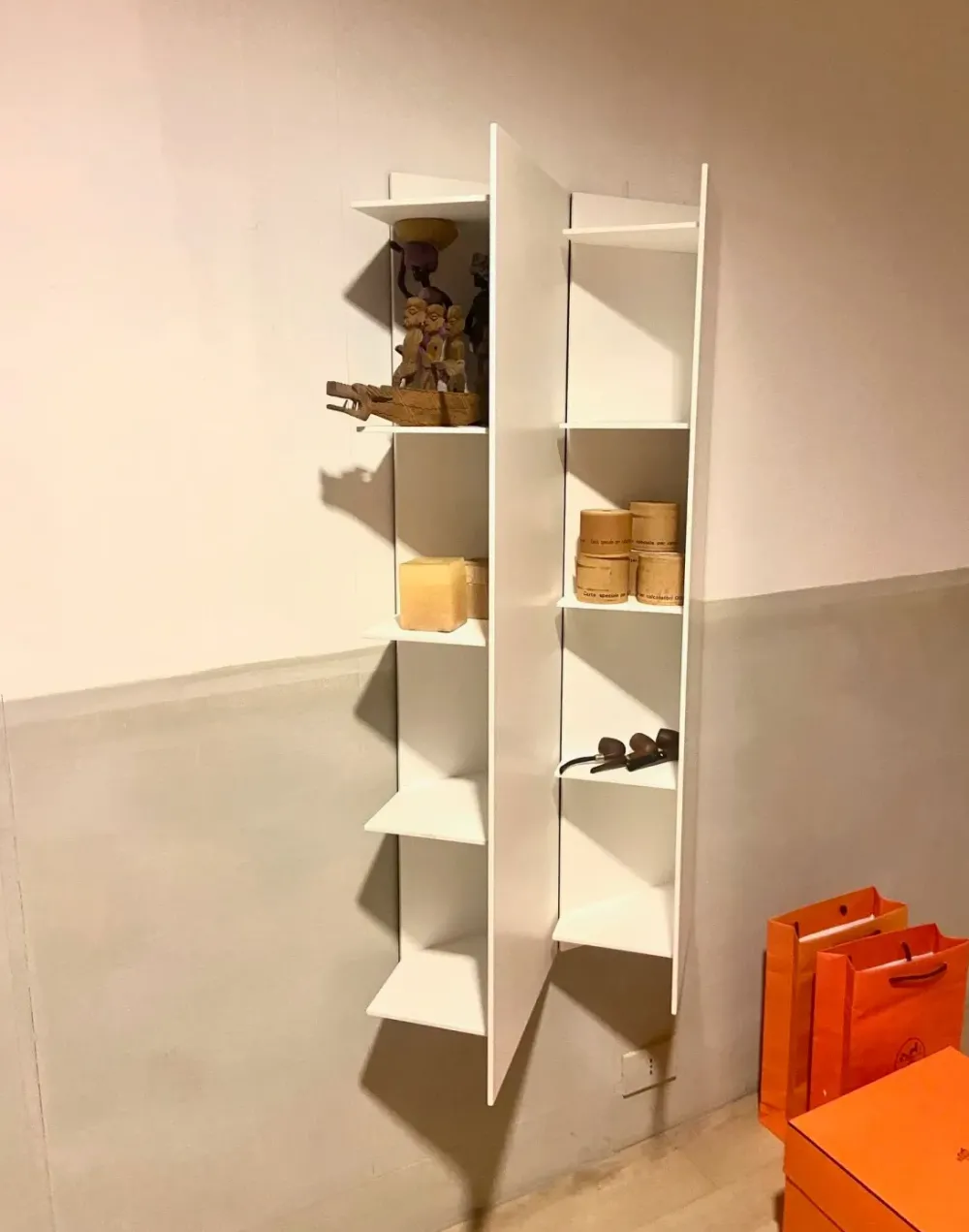 sistema ciomponibile di contenitori reversibili ,ossia con lato a giorno a montato a destra o a sinistra, realizzati in solid surface bianco