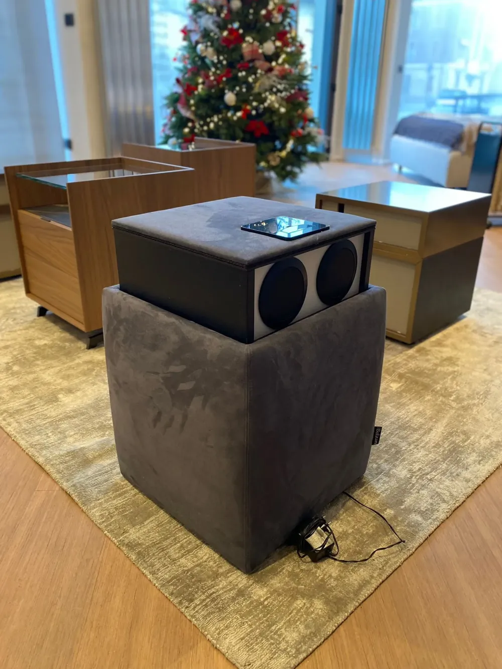 ARES di Bolzan è un pouf multifunzione, pratico e versatile. Qui presentato nella versione personalizzata con accessori opzionali come il cassetto push-pull e la dock station.
