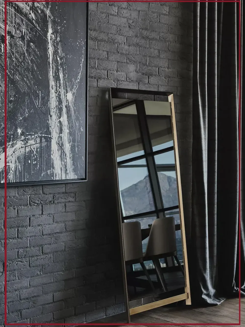 Pensato come specchio da terra con fissaggio a parete, si distingue per la sua struttura in acciaio laccato, che incornicia la superficie riflettente con sobrietà e solidità.