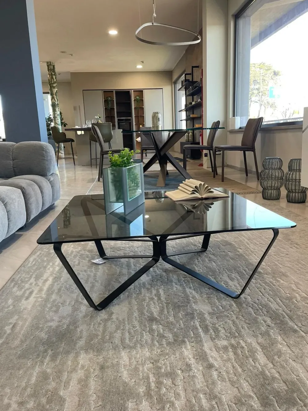 Tavolino con base metallica nero e piano in cristallo lucido fumè.