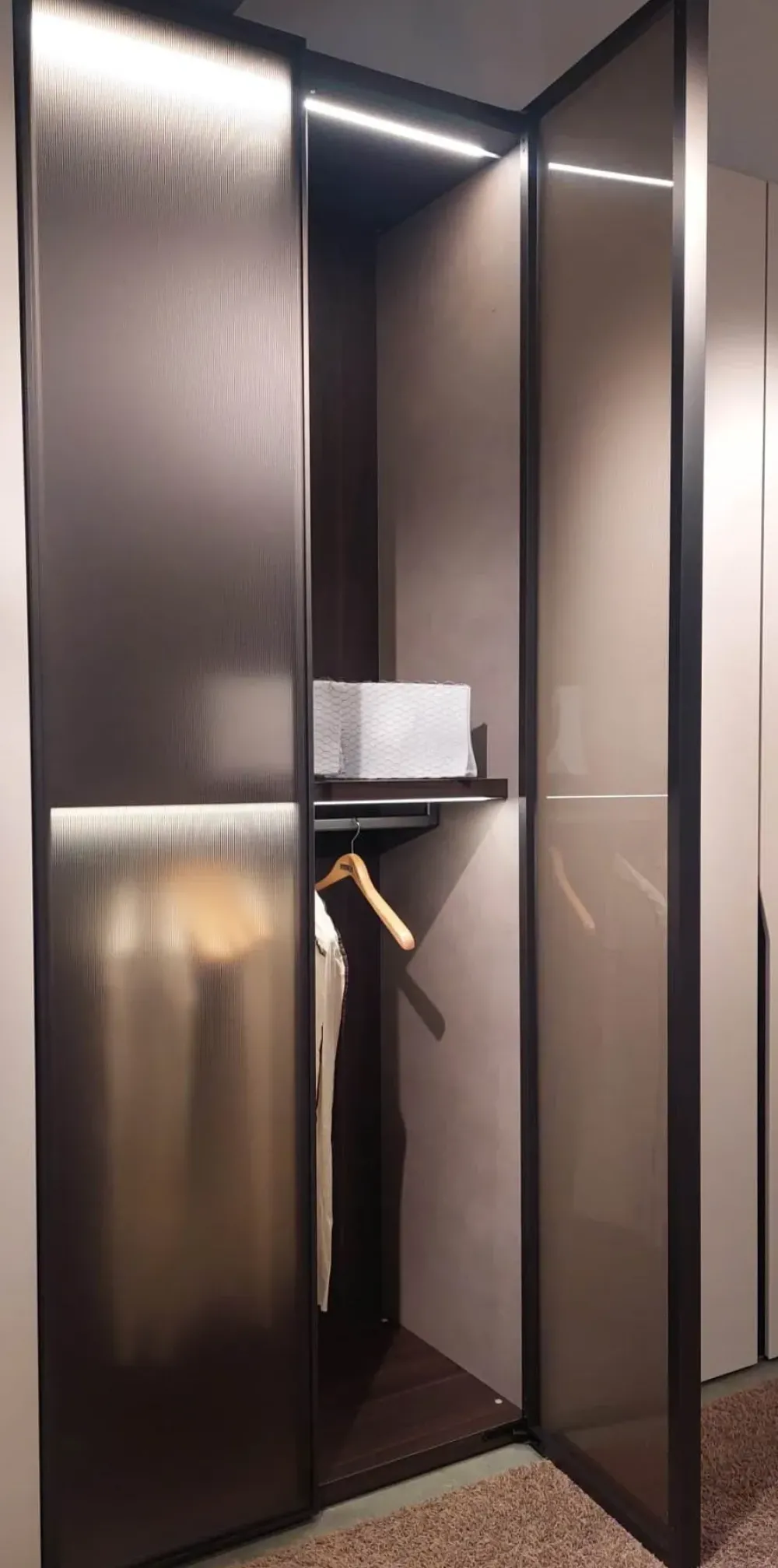 Camera completa Pianca composta da armadio modello Manhattan ad ante battente laccato opaco seta con fianco terminale in vetro bronzo, due ante in vetro rigato e telaio canna di fucile completa di luci led cassettiera e ripiani (L 404Xh258). Letto modello Embrace kingsize con contenitore in tessuto Draco (L206 x P230), comodini Dedalo diametro 44 cm con cassetti, basamento titanio, laccato opaco seta e top in marmo lucido Emperador. ESCLUSO MATERASSO. POSSIBILITA’ DI ACQUISTO ELEMENTI ANCHE SEPARATAMENTE.