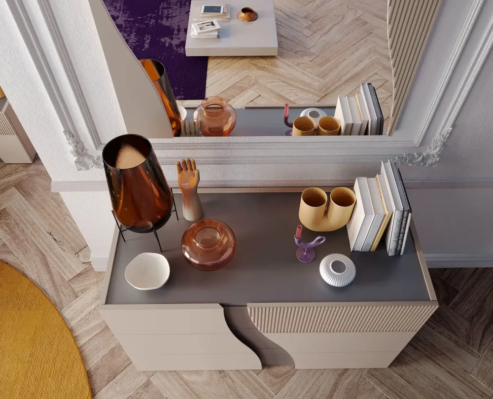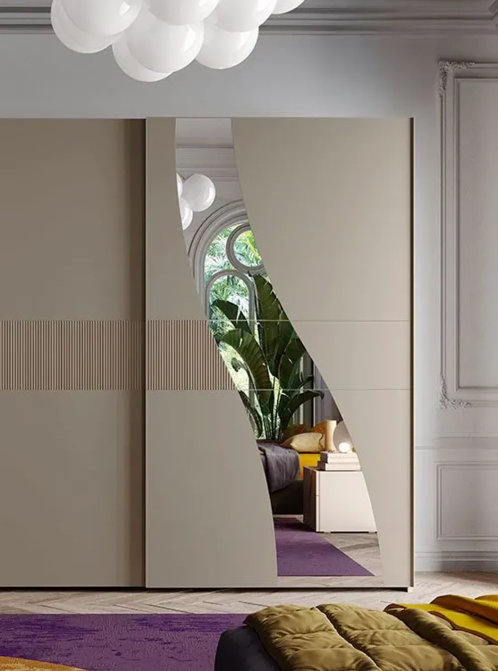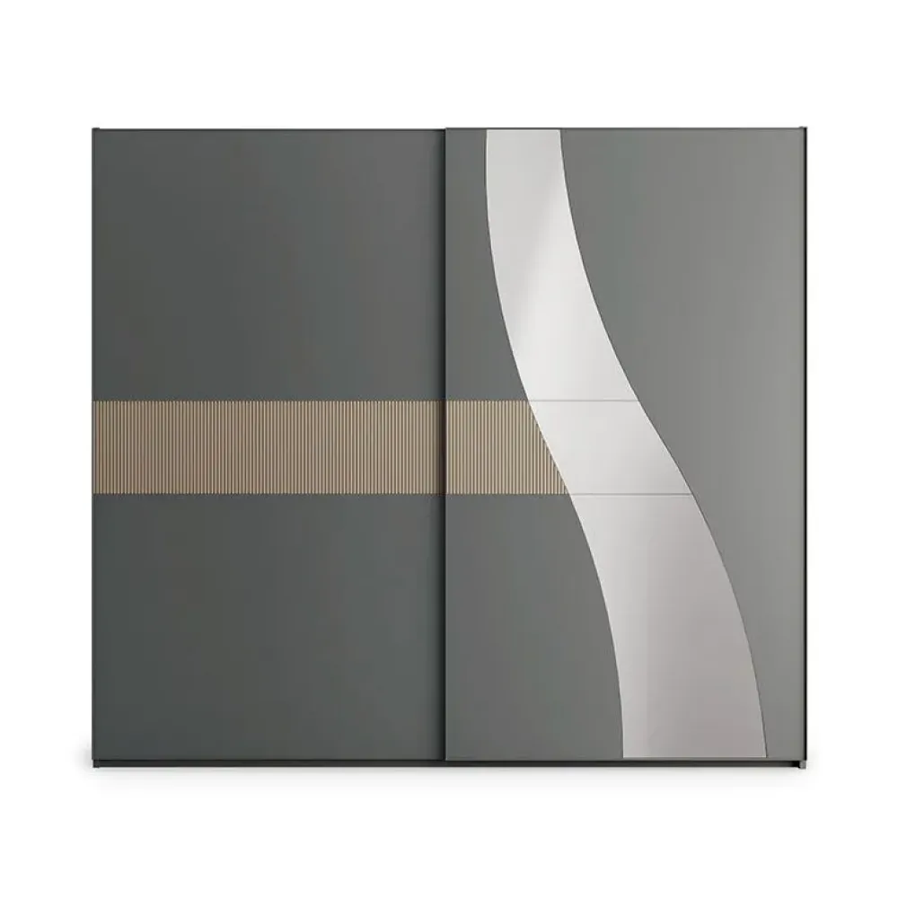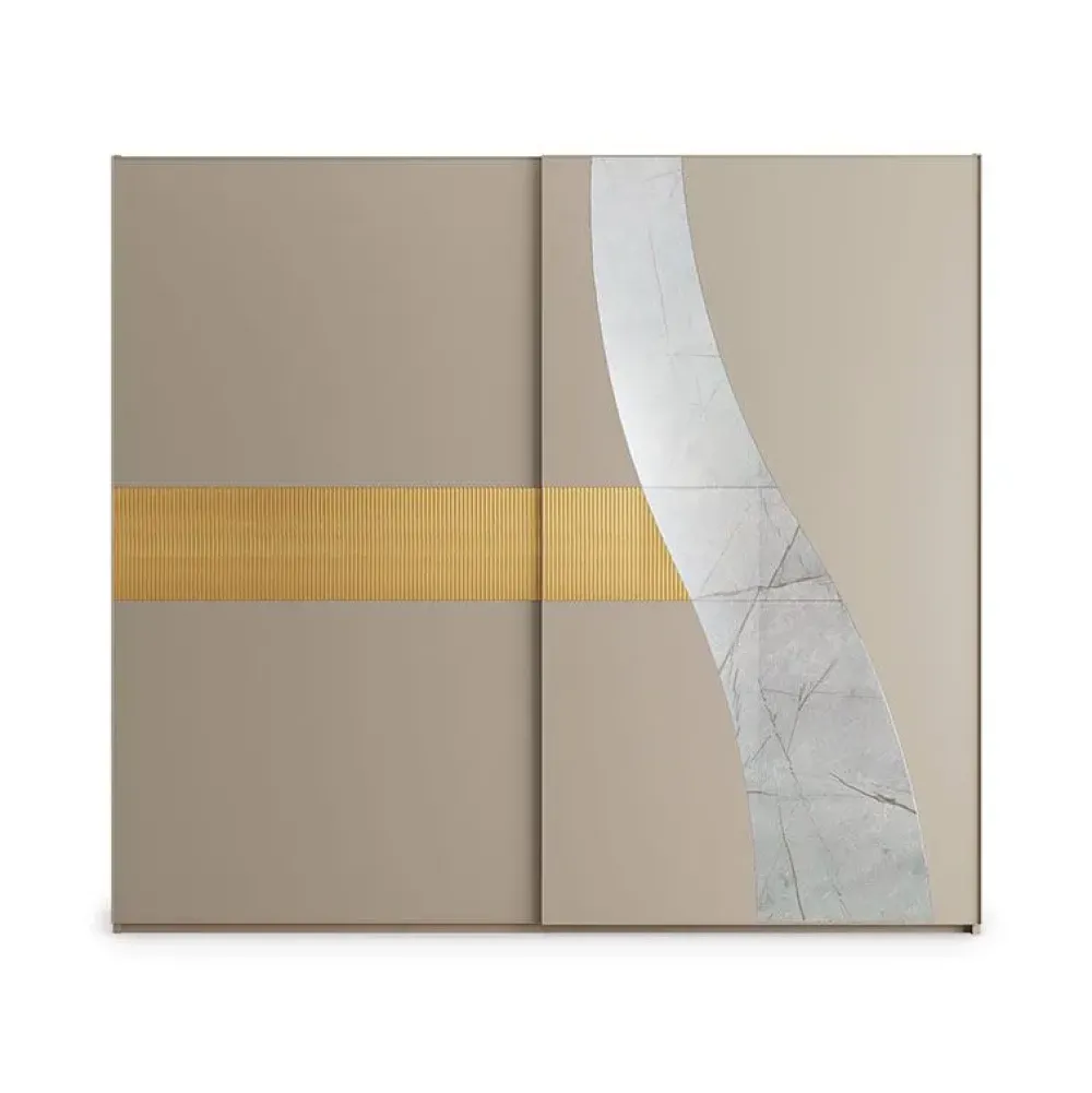 Armadio 2 ante scorrevoli struttura color corda con inserti cannettati corda e specchio. Interni inclusi: nr. 2 ripiani e una cassettiera a 3 cassetti. Led interni all’armadio inclusi.