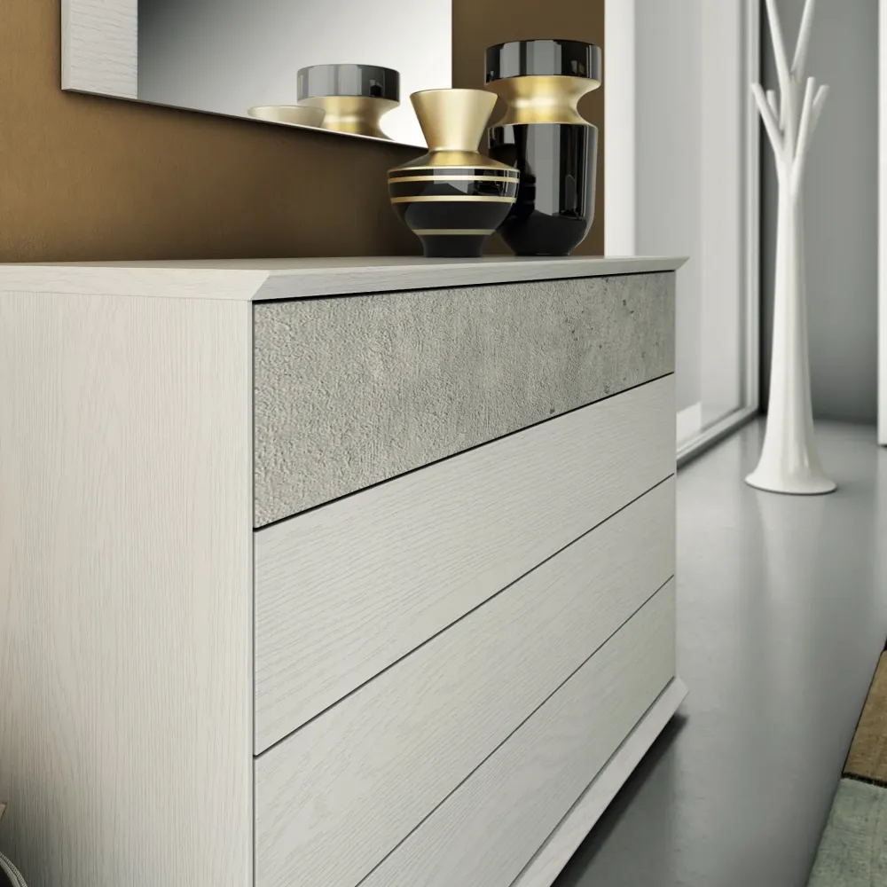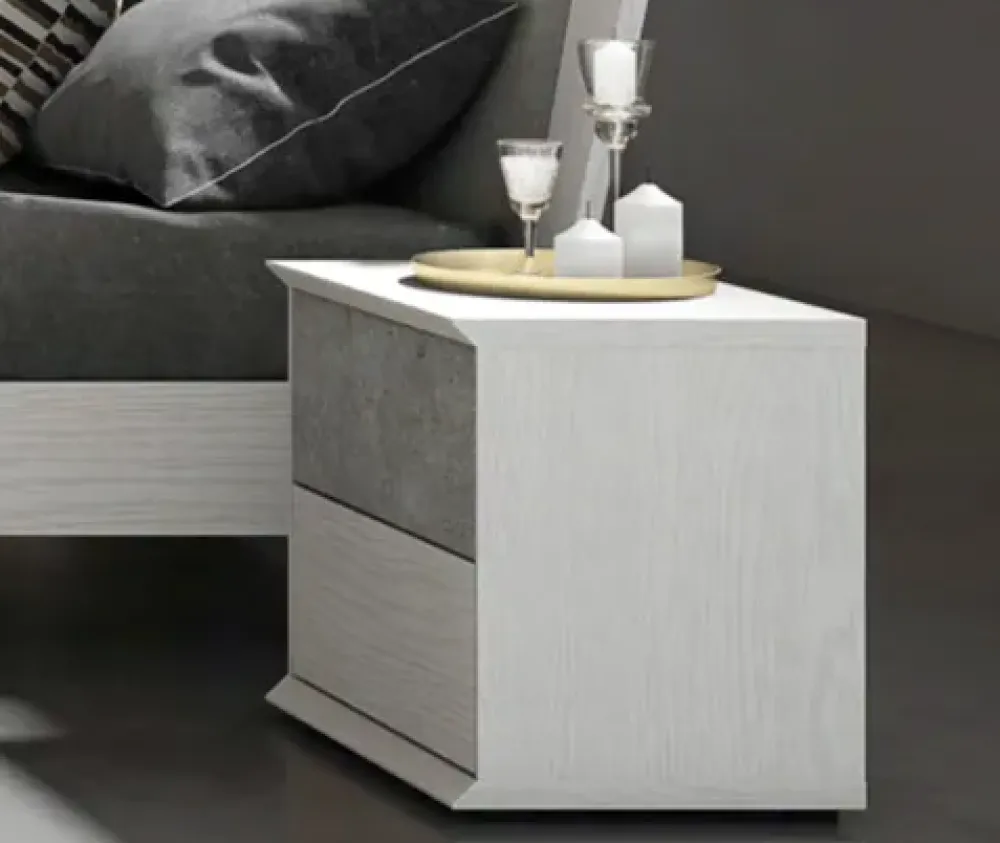 COMO’ E 2 COMODINI CON SISTEMA DI APERTURA PUSH PULL IN LAMINATO FRASSINO BIANCO CON IL PRIMO CASSETTO EFFETTO CEMENTO.