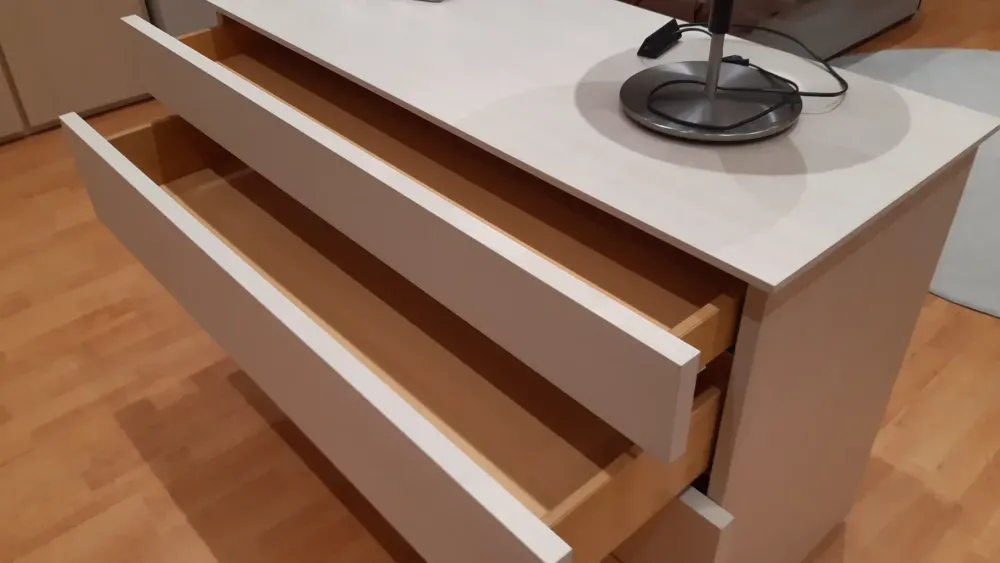 A completare l’arredamento troviamo due eleganti comodini, ciascuno dotato di due cassetti in legno, perfetti per tenere a portata di mano tutto ciò che serve durante la notte. Il comò abbinato, anch’esso con quattro cassetti spaziosi, aggiunge ulteriore spazio contenitivo senza rinunciare allo stile.