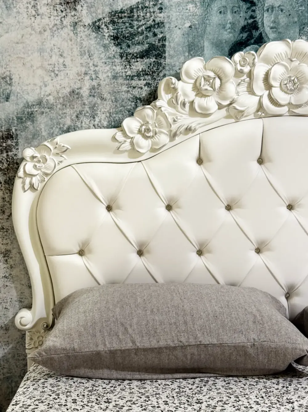 La camera da letto romantica modello Viola di Mobilpiù è il giusto compromesso tra stile classico e design moderno ideale per gli amanti delle forme tradizionali abbinate a colorazioni moderne ed attuali. Una camera matrimoniale raffinata e preziosa dalle forme morbide e sinuose che danno vita a mobili di grande charme, caratterizzati da lavorazioni accurate come il particolare del fiore realizzato con raffinati glitter e il dettaglio della testiera del letto decorata. Domina la scena la preziosa maniglia abbinata all’armadio, al comò e ai comodini realizzata con materiali di grande pregio come gli Swarovski che fanno richiamo alla testiera del letto capitonné imbottita in ecopelle.