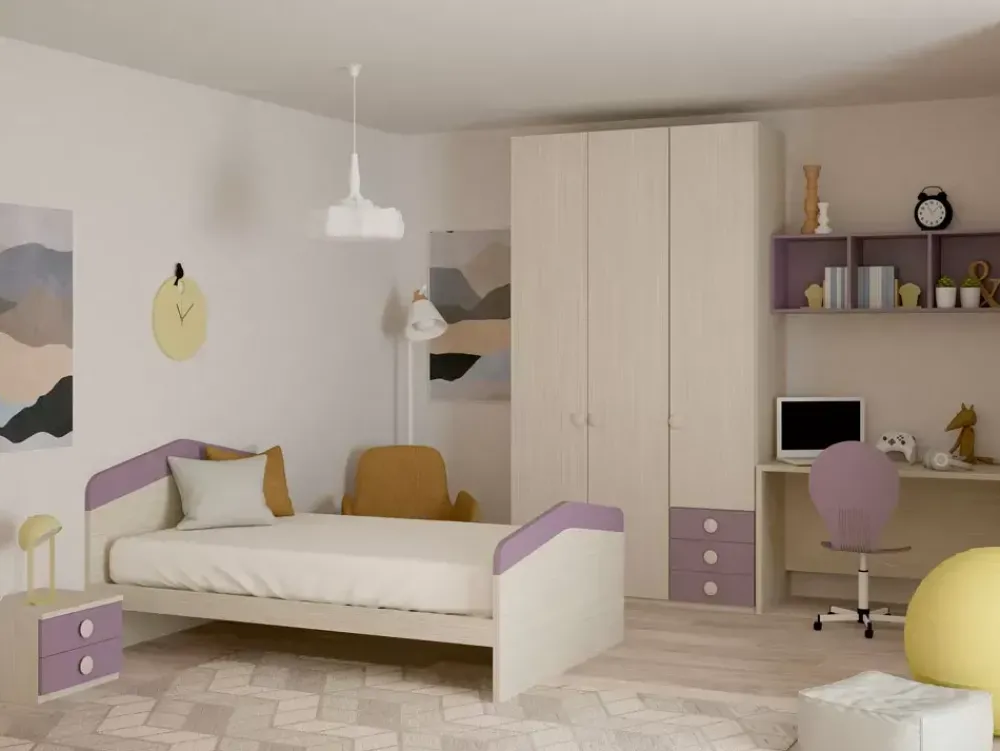 Per ammobiliare la stanza dei più piccoli coniugando estetica e sicurezza, ti presentiamo qui la proposta 02 in offerta outlet. Questa proposta si presta a ricreare un ambiente confortevole e ben organizzato, dove è possibile dedicarsi alla scuola, divertirsi e rilassarsi. I colori di tendenza e i materiali sicuri che sono usati la rendono una cameretta in grado di durare negli anni e di compiacere i genitori e i piccoli.