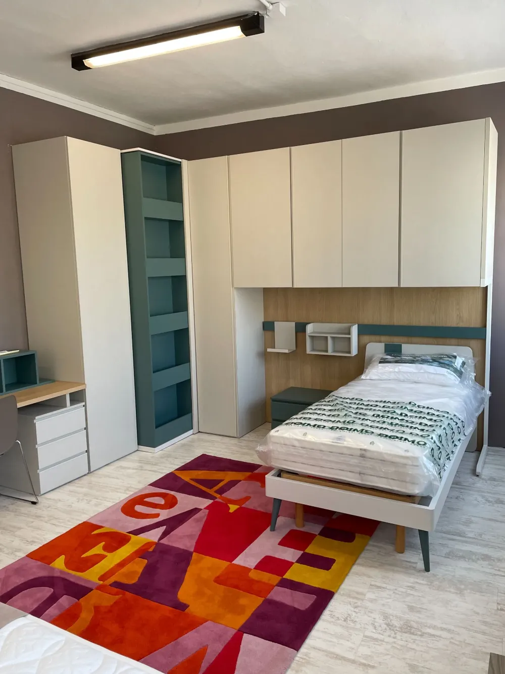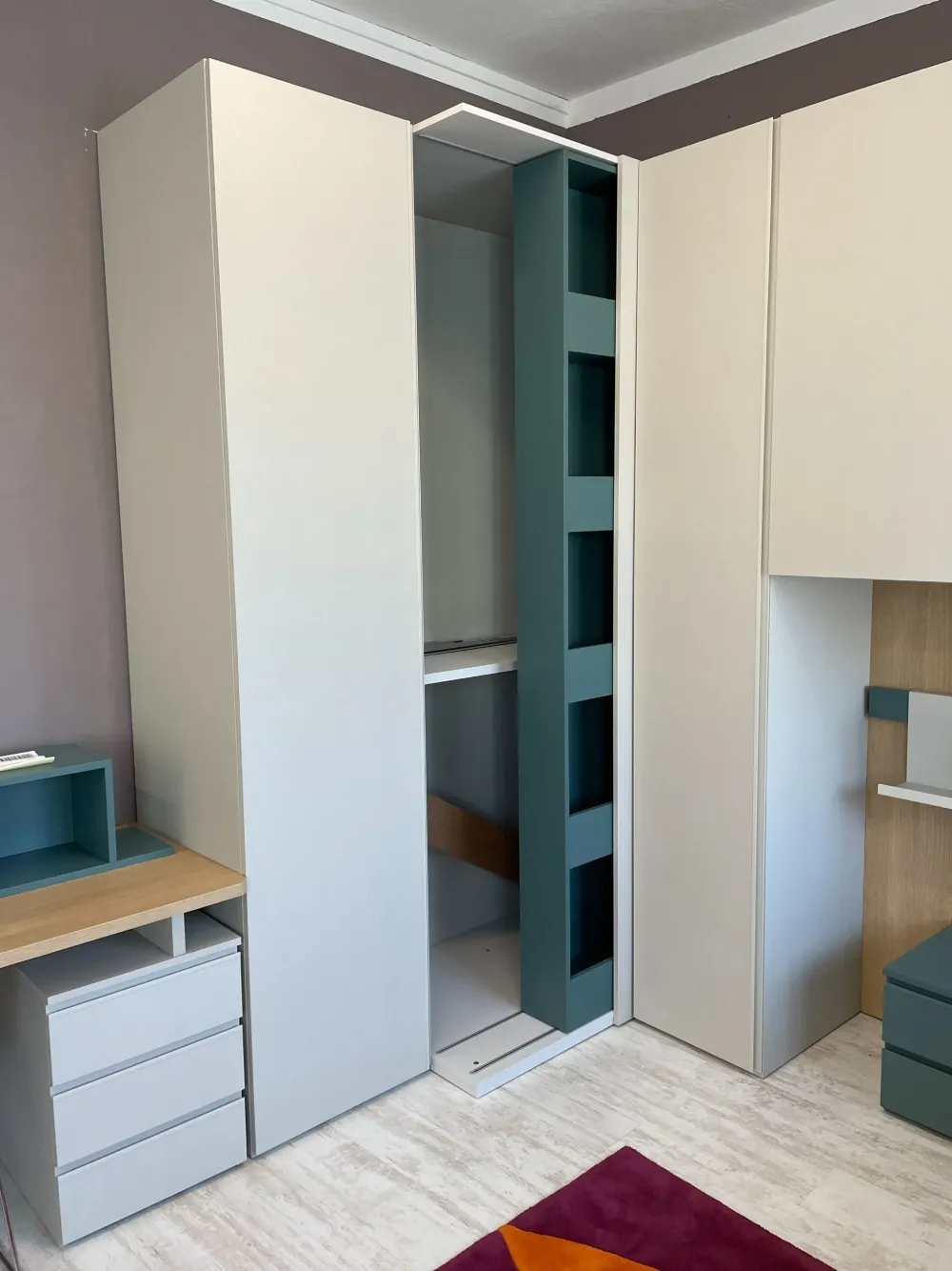 Cameretta – ponte ad angolo nelle finiture in laminato tinta Seta e Canapa con inserti tinta Petrolio e Rovere, nelle dimensioni indicative L 3,7 x 3,45 cm. Cabina ad angolo con struttura libreria scorrevole a tutta altezza come l’armadio che si innesca nella struttura ponte con pensili strutturali di altezza H 110 cm, in appoggio su una schiena strutturale tinta Rovere e su un fianco in metallo tubolare sezione quadra. Letto singolo con testiera in appoggio su schienale ponte, scrittoio da L 135 x 59 cm con piano in tinta Rovere dotato di sedia con struttura in metallo a slitta.