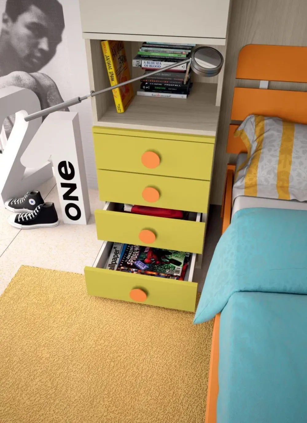 Perché è una vera e propria stanza su misura: il sistema a ponte integra letto, armadi, vani a giorno e pensili in un unica struttura armoniosa, lasciando ampio spazio libero a terra per movimento, gioco e creatività. Le finiture in Olmo, Sabbia, Lime e Arancione donano energia, luce e personalità, trasformando la cameretta in un luogo stimolante e accogliente.
