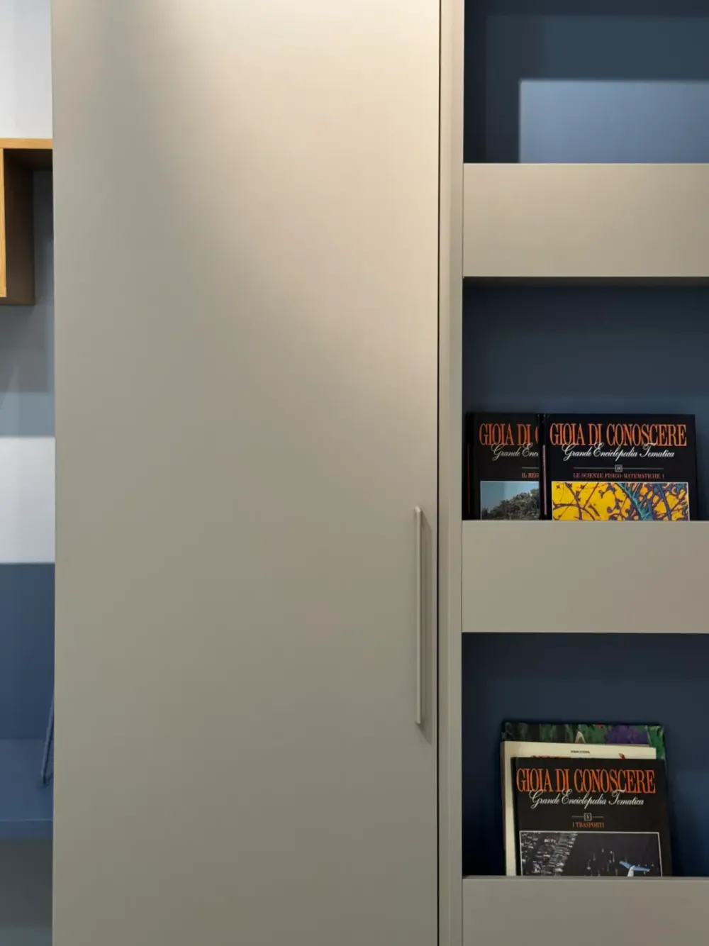 La Cameretta Evo1 di Mistral è una soluzione multi-spazio dedicata allo studio e alle attività ricreative per i più grandi, ma anche per accompagnare i più piccoli nella loro crescita e in ogni momento della giornata. L armadio Covert con libreria scorrevole e battente anta liscia in finiture Seta e Cobalto è spazioso e funzionale. L area studio è proposta in una soluzione pratica che si adatta a ogni spazio ed è arricchita dallo scrittoio sospeso Cobalto con cassetto pensile, la sedia coral e dai moduli a giorno sospesi. Il letto Mail da una piazza e mezza presenta un giroletto dritto e un pannello schienale. Si aggiunge un comodino da due cassetti munito di rotelle in finitura rovere.