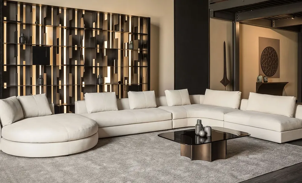 Oasi componibile, prevede moduli differenti con due/tre sedute ognuno. La struttura interna è in legno di faggio e multistrato di pioppo, con inserti in multistrato e il molleggio è garantito da cinghie elastiche indeformabili. Il rivestimento strutturale è in poliuretano espanso, a quote differenziate ad alta densità, e lo strato superiore ad alta componente elastica. La cuscinatura è a densità differenziata indeformabile in piuma e falda sintetica. Una piastra in metallo bronzato, tagliata a laser, contiene il divano decorando e creando contemporaneamente un riflesso luminoso in questo imbottito. La chaise longue ha lo schienale allungato per contenere il pouf. Il pouf è rivestito con lavorazione a capitonné leggero. L’isola rotonda, ha una spalliera circolare con struttura metallica, imbottita e rivestita in pelle. La componibilità permette di creare dimensioni differenti a seconda dei moduli scelti che possono essere riprogettati di volta in volta.