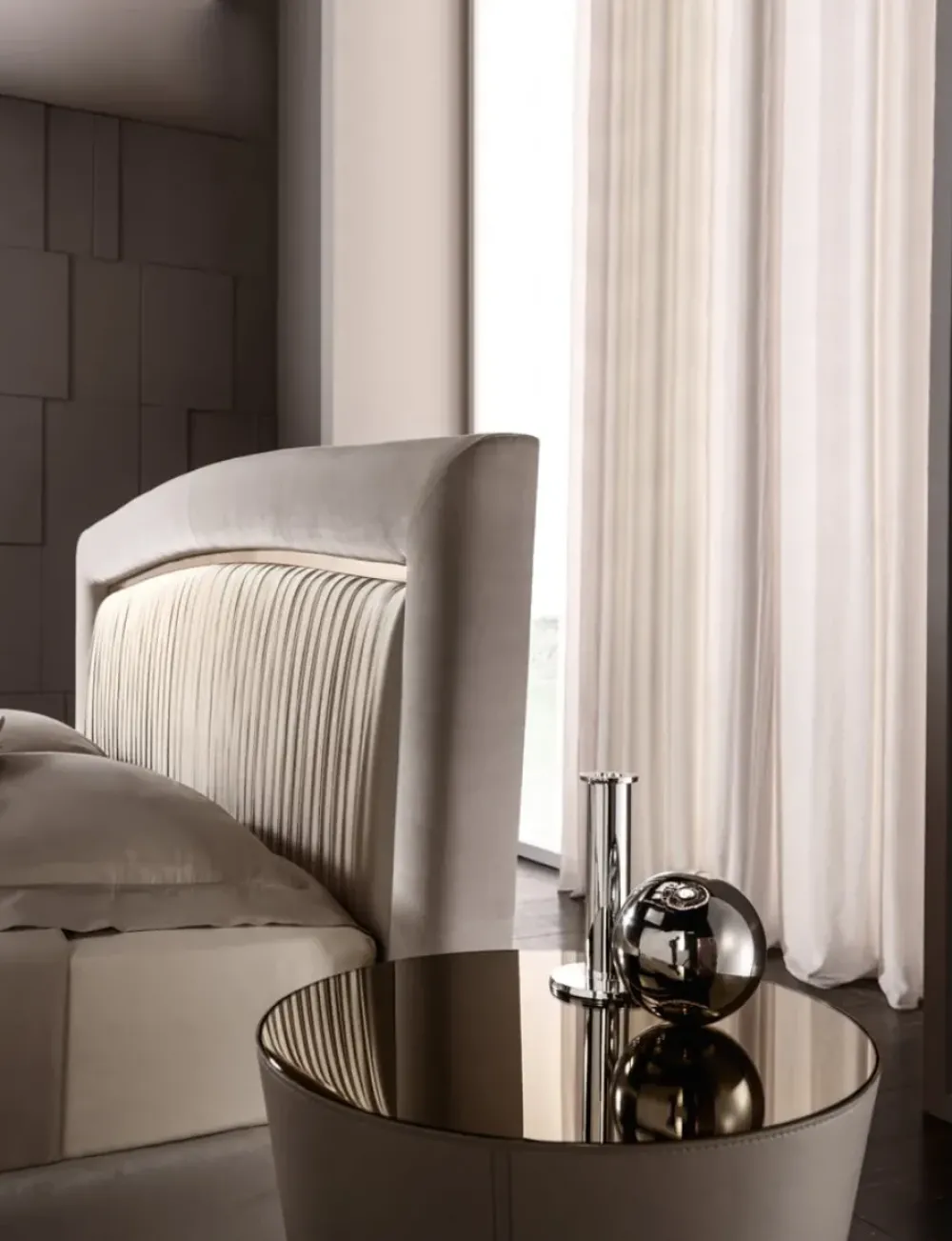 La struttura è imbottita e rivestita, a mano con lavorazione sartoriale, in raso plissettato abbinato al velluto, tessuto, pelle, ecopelle o a un tessuto fornito dal cliente. Il suo design pulito è impreziosito dal doppio tessuto e dal dettaglio in oro. Il letto Portofino Plissè fa da corona ad una camera da letto classica e internazionale; è disponibile in varie dimensioni per reti da cm: 160×200 (letto matrimoniale), 180×200 (letto matrimoniale) e 200×200 (letto king size) anche nella versione con box contenitore.