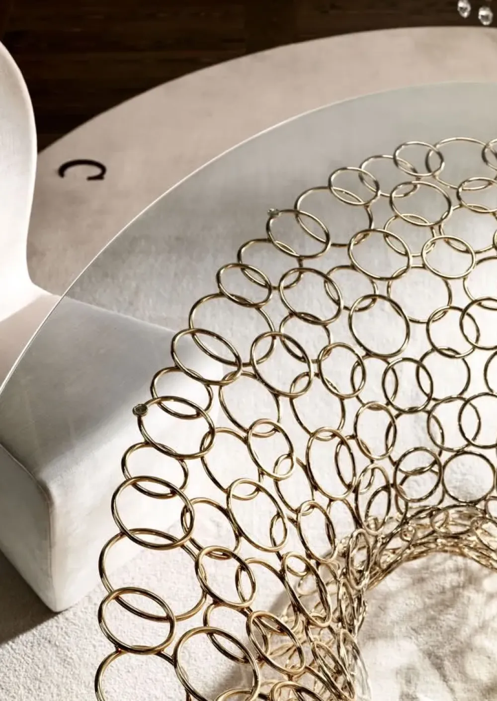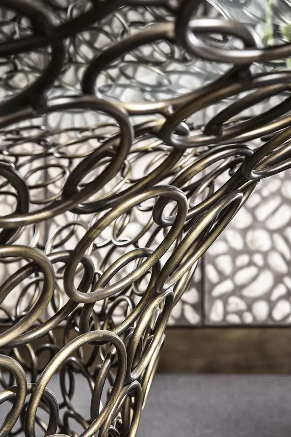 È composto da numerosi cerchietti delle stesse dimensioni, in ferro pieno che, saldati tra loro uno ad uno, si fondono insieme fino a formare un vortice omogeneo.