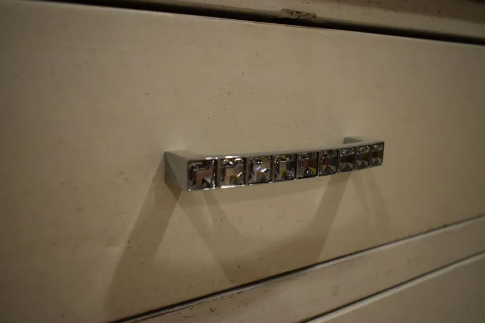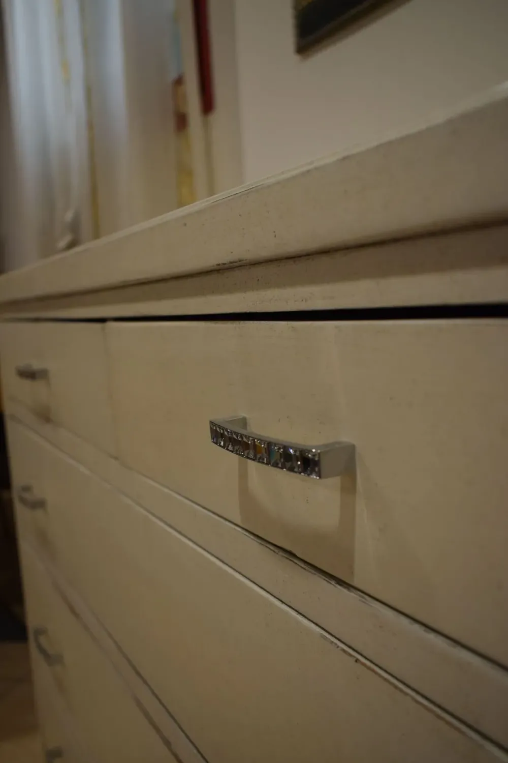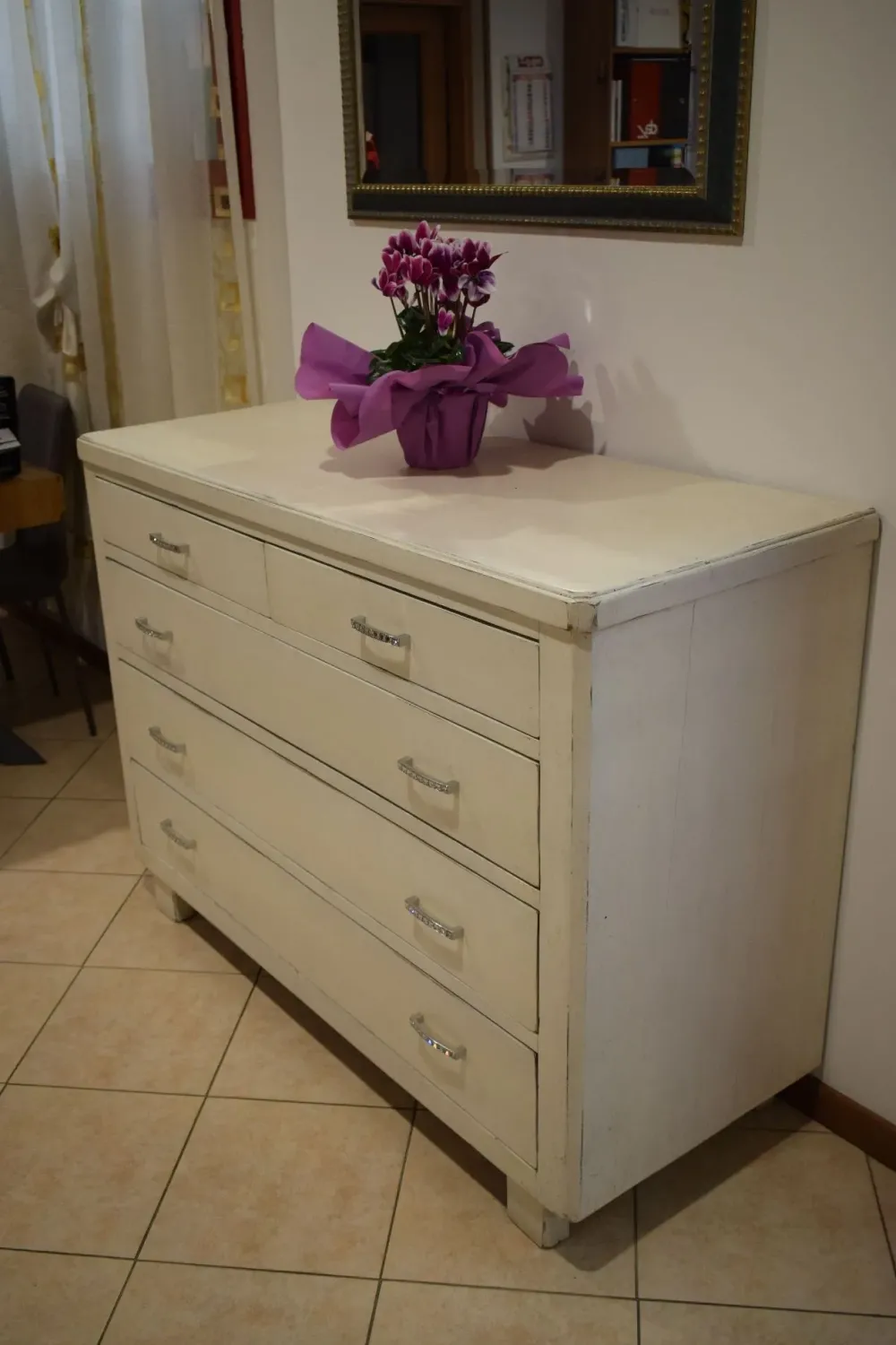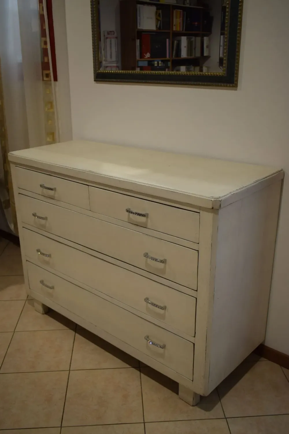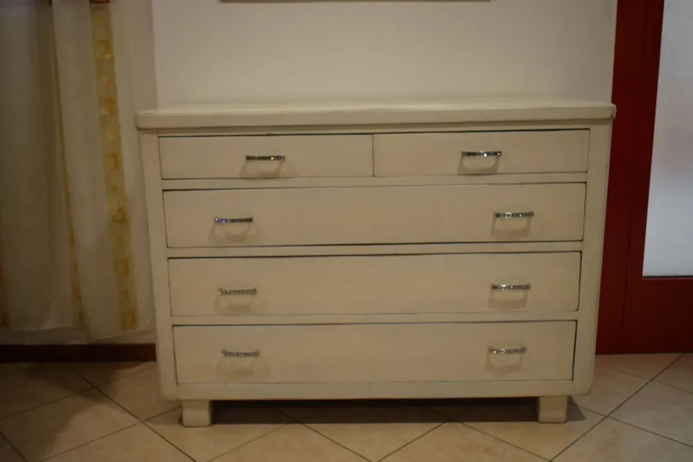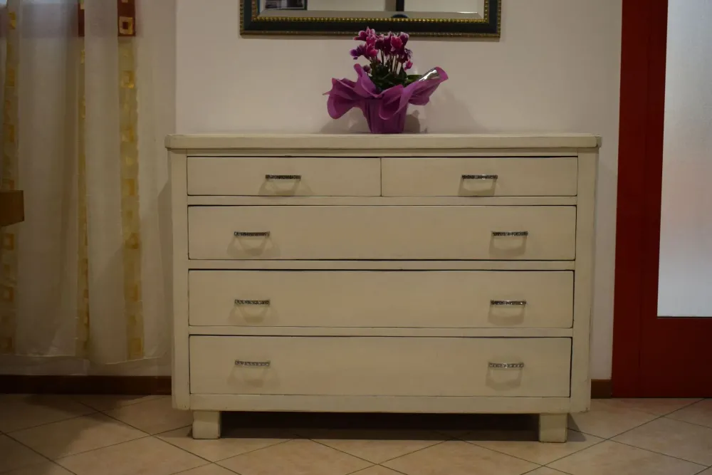 Dalla collezione Mottes, presentiamo comò in legno finitura bianca anticata. Dispone di tre ampi cassettoni, due cassetti, piano con ampio spazio d’appoggio. Maniglie in metallo lucido con inserti swarovski, piedi in legno altezza 10cm. Ha una larghezza di 130cm, Altezza complessiva 97cm, Profondità 53cm. un bel comò in legno antico sciabby Consegna compresa nel prezzo in tutta Italia. L’offerta per questa cassettiera è di euro 600,00. Approfitta dello sconto! Contattaci via mail o passa nel nostro showroom per toccare con mano le nostre proposte.