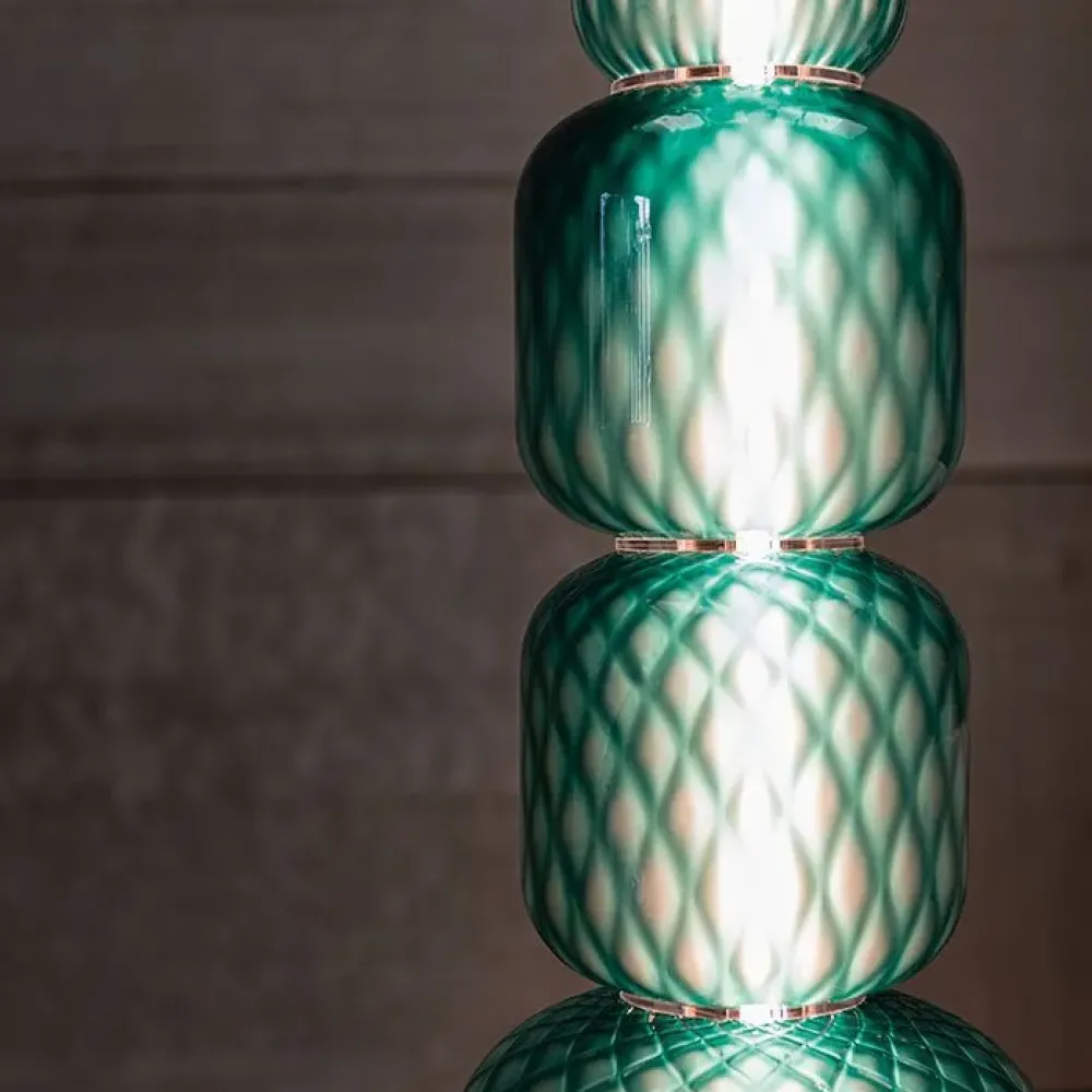 Ogni elemento della lampada è caratterizzato da un pattern tridimensionale a rombi incrociati, realizzato grazie a uno stampo in metallo. Le punte all’interno dello stampo, durante la soffiatura, modellano il vetro fuso creando il tipico effetto sfaccettato della lavorazione Balloton.