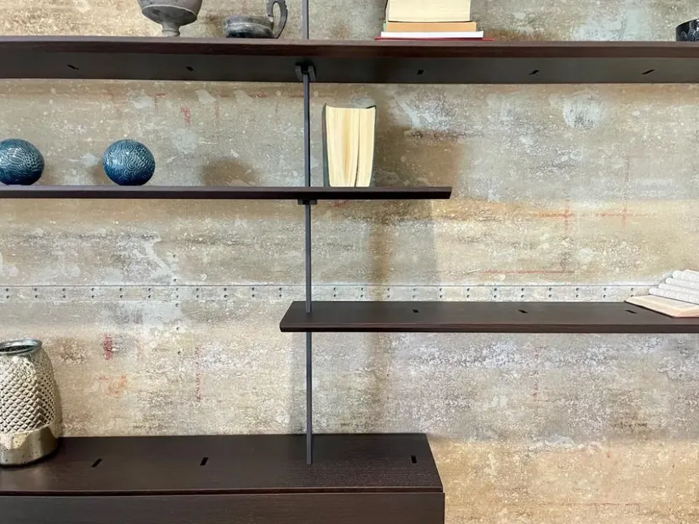 Libreria componibile con fissaggio a muro, composta da montanti e staffe in acciaio verniciato goffrato grafite, ripiani e box contenitore in legno finitura rovere bruciato.