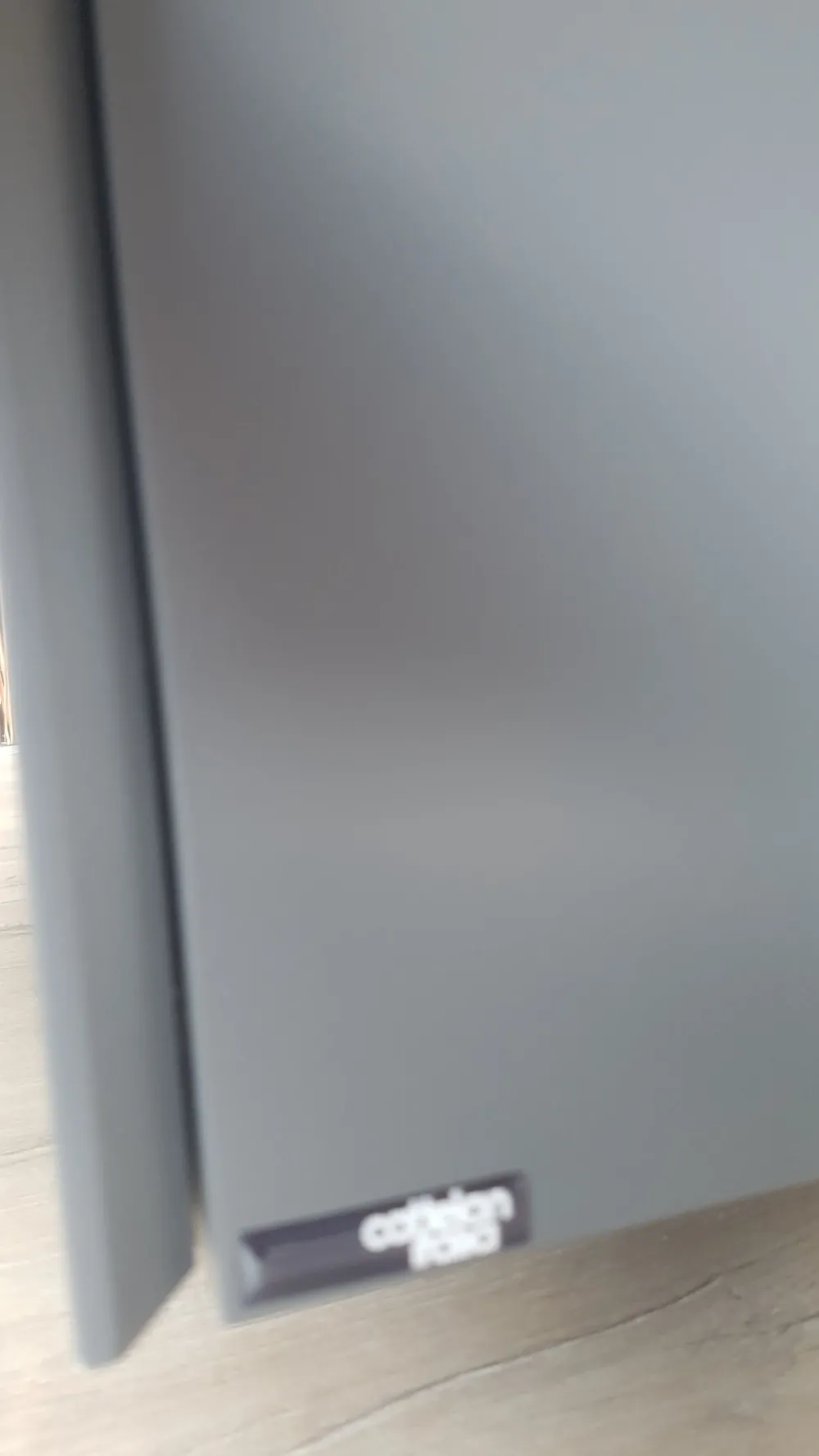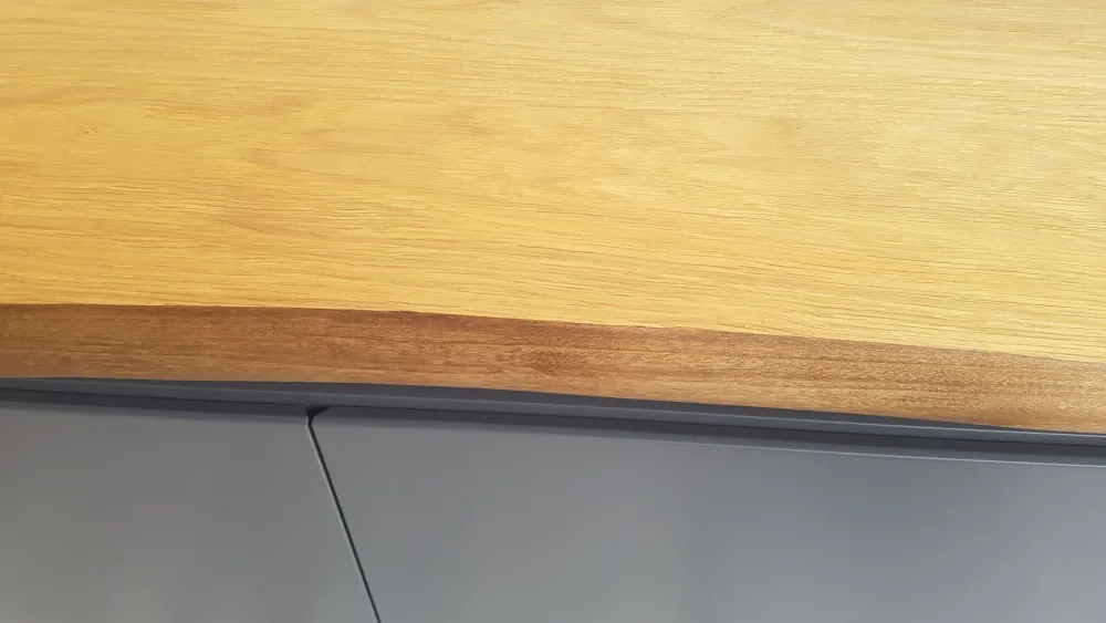 Legno MDF verniciato opaco color graphite, piano in rovere naturale con bordo irregolare.