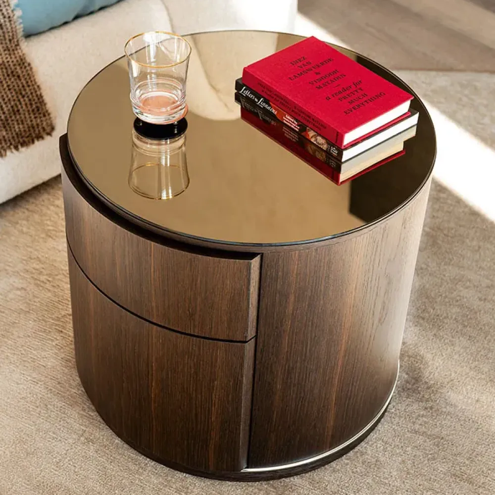 Il profilo inferiore è infine realizzato in acciaio cromato, per donare un tocco di lucentezza e impreziosire ulteriormente questo comodino in legno rotondo, nonché la tua camera matrimoniale di design nella sua totalità.