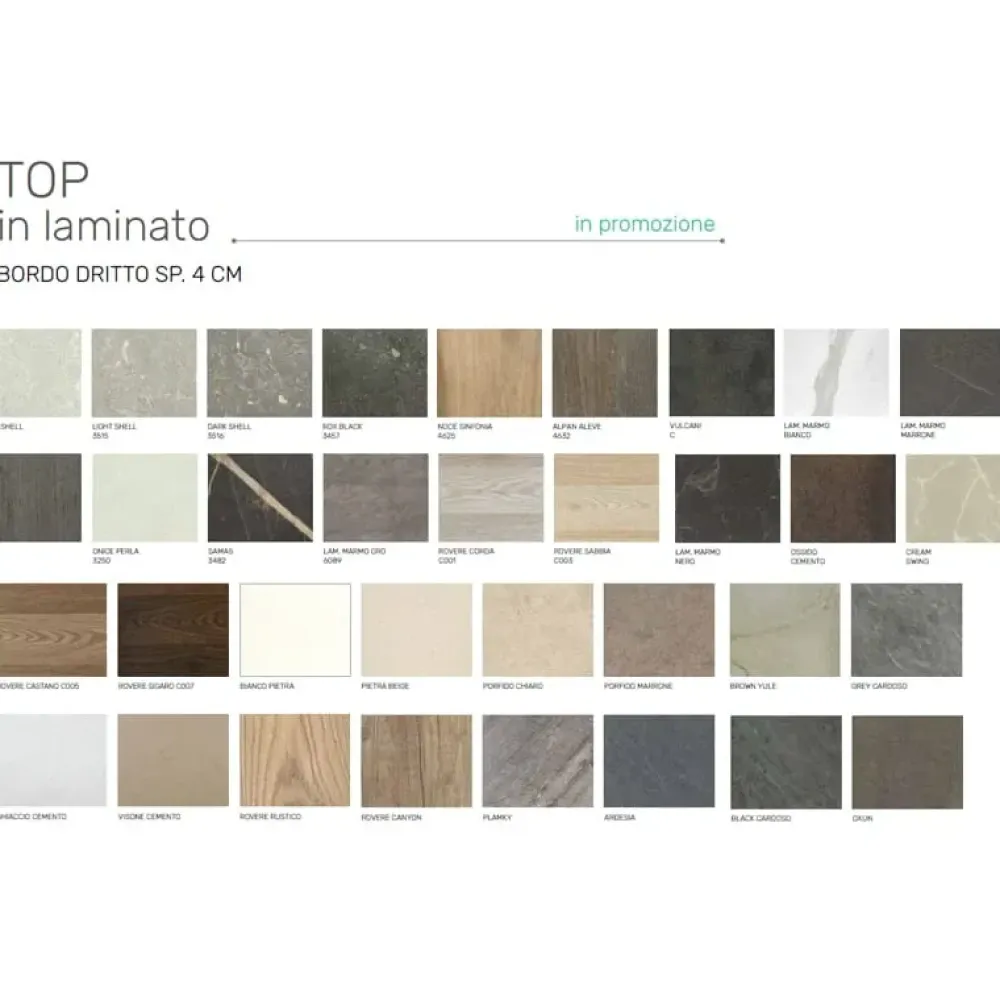 - Con lo scopo di impreziosire il mood dell’ambiente, assume un ruolo di primaria importanza il top cucina: qui incluso nel costo, c’è un piano di lavoro in laminato perfetto per durare negli anni pur mantenendo le sue caratteristiche peculiari.
