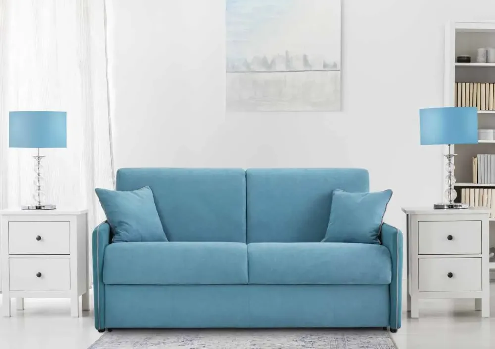 Divano GLORIA 3 posti letto + 2 cuscini arredo 45 cm x 45 cm inclusi Dimensioni divano: 174 cm (lunghezza) x 95 cm profondità x 96 cm (altezza) Dimensioni divano-letto aperto: 174 cm (lunghezza) x 203/212 cm (profondità) e materasso incluso alto 17 cm Struttura mista in metallo e agglomerato di legno Imbottitura, schienale e cuscini in poliuretano espanso a densità differenziate Meccanismo in rete elettro saldata Sospensione seduta con cinghie elastiche ad alta resistenza Rivestimento in tessuto completamente sfoderabile.