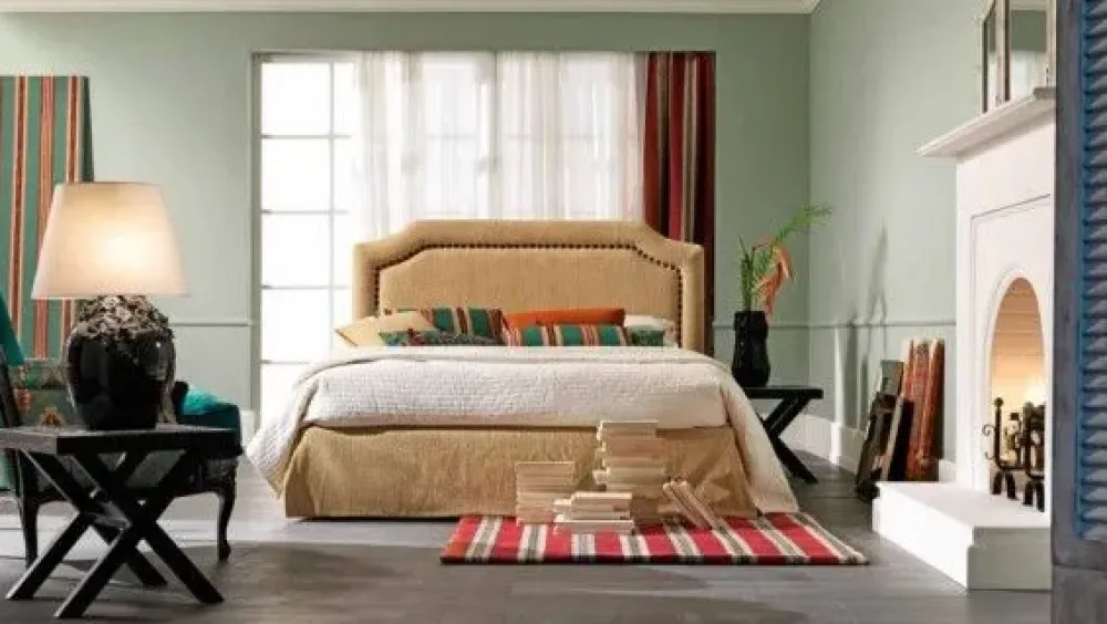 La testata in parte lineare con bordi incurvati caratterizzata da un profilo borchiato che incornicia la parte superiore del letto ( disponibili in diverse tipologie).