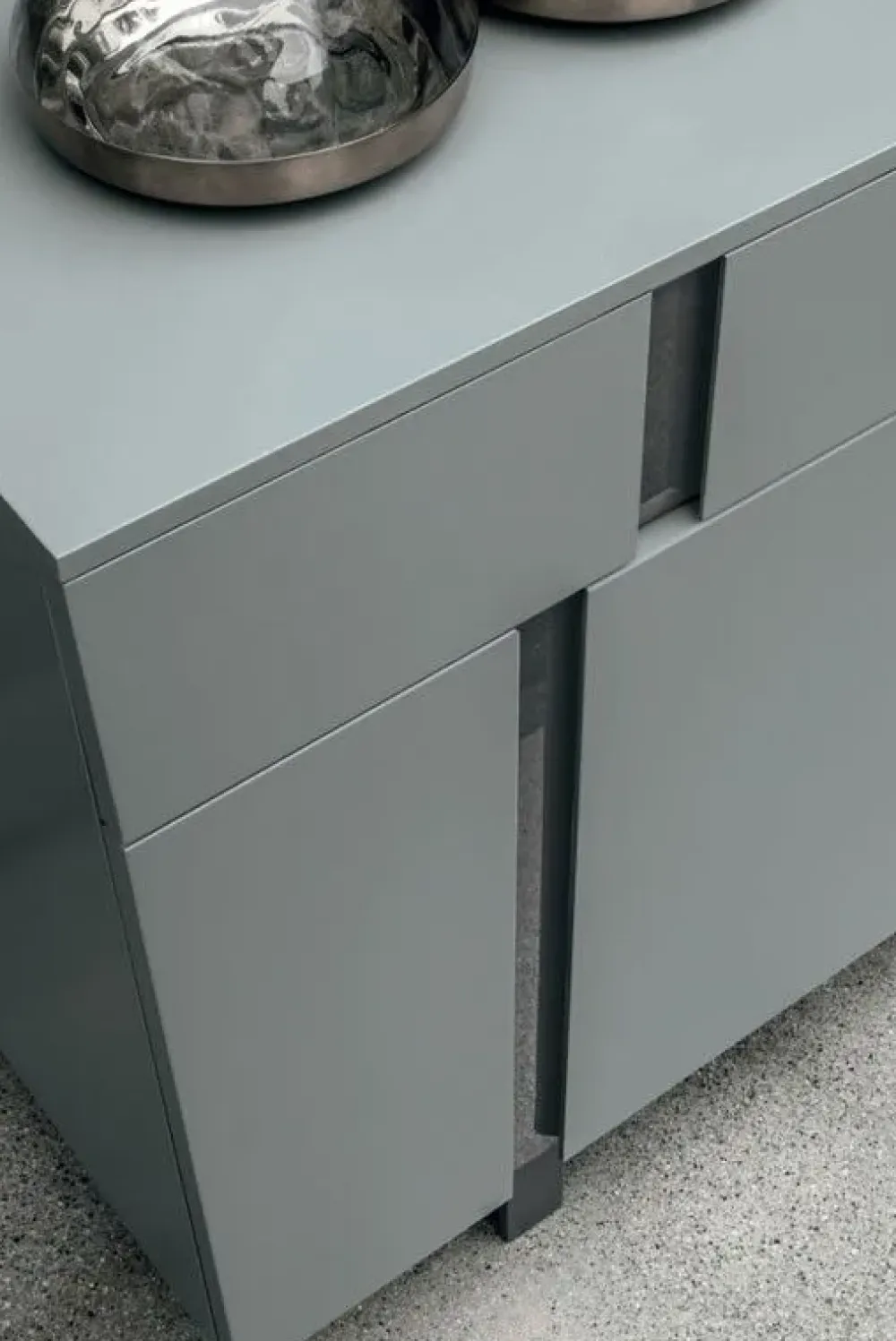 La madia ha la struttura in laccato opaco pomice, l’inserto è in vetro lucido laccato antracite e il basamento in finitura antracite.