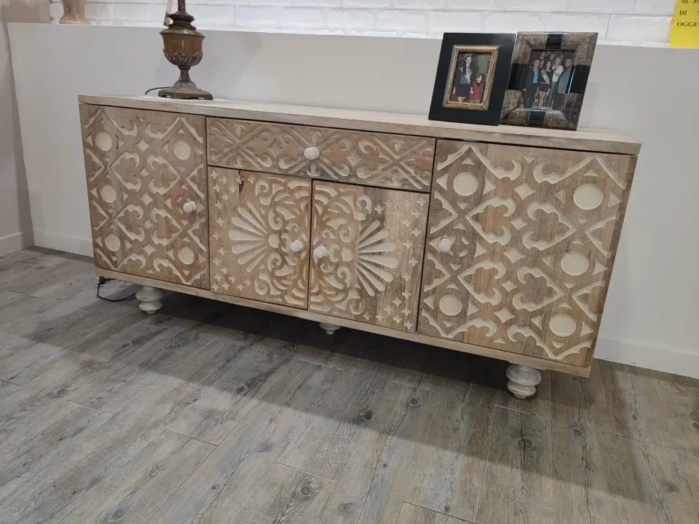 Madia in massello di legno mango l.160 h.75 p.45 con intarsio pantografato a prezzo scontato.