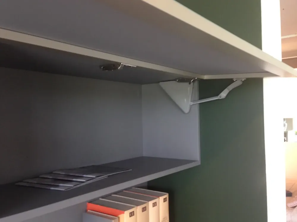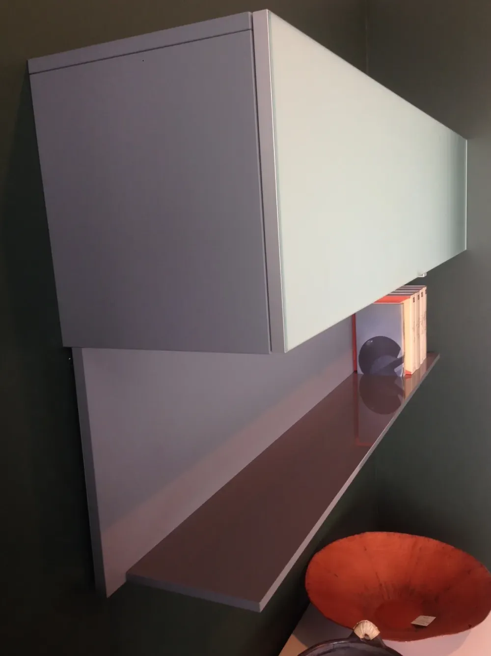 Il pensile è lungo cm 180 ed ha l’anta in vetro acidato montata su telaio in alluminio. Sotto il pensile è montata una mensola lucida con pannello opaco.