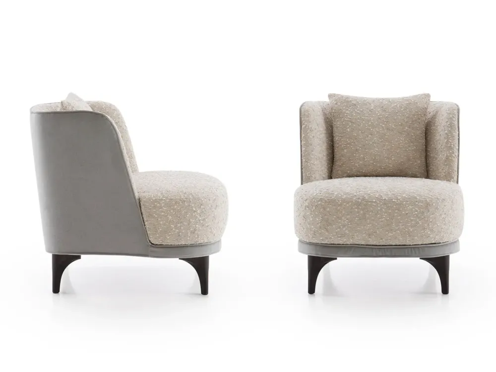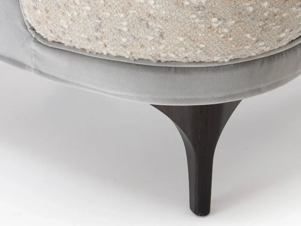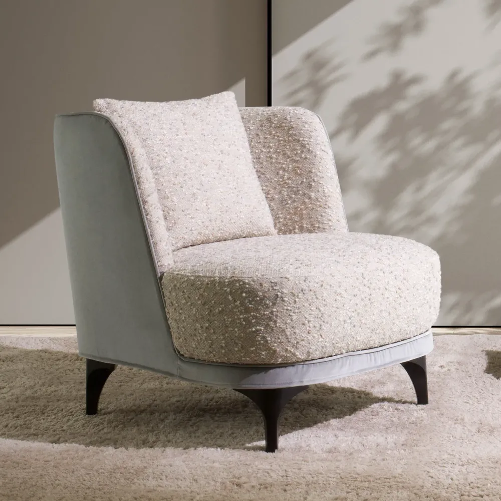 Il rivestimento bicolore, raffinato e ricco di personalità, abbina con equilibrio un tessuto bouclé misto lana per l interno schienale e la seduta, a un velluto effetto scrivente utilizzato per la struttura e il retro schienale, creando un contrasto elegante che valorizza la poltrona Amanda Outlet.