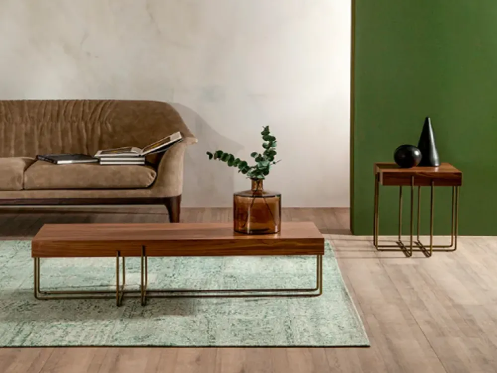 Tavolino con struttura in metallo top rivestito in legno, gres porcellanato.