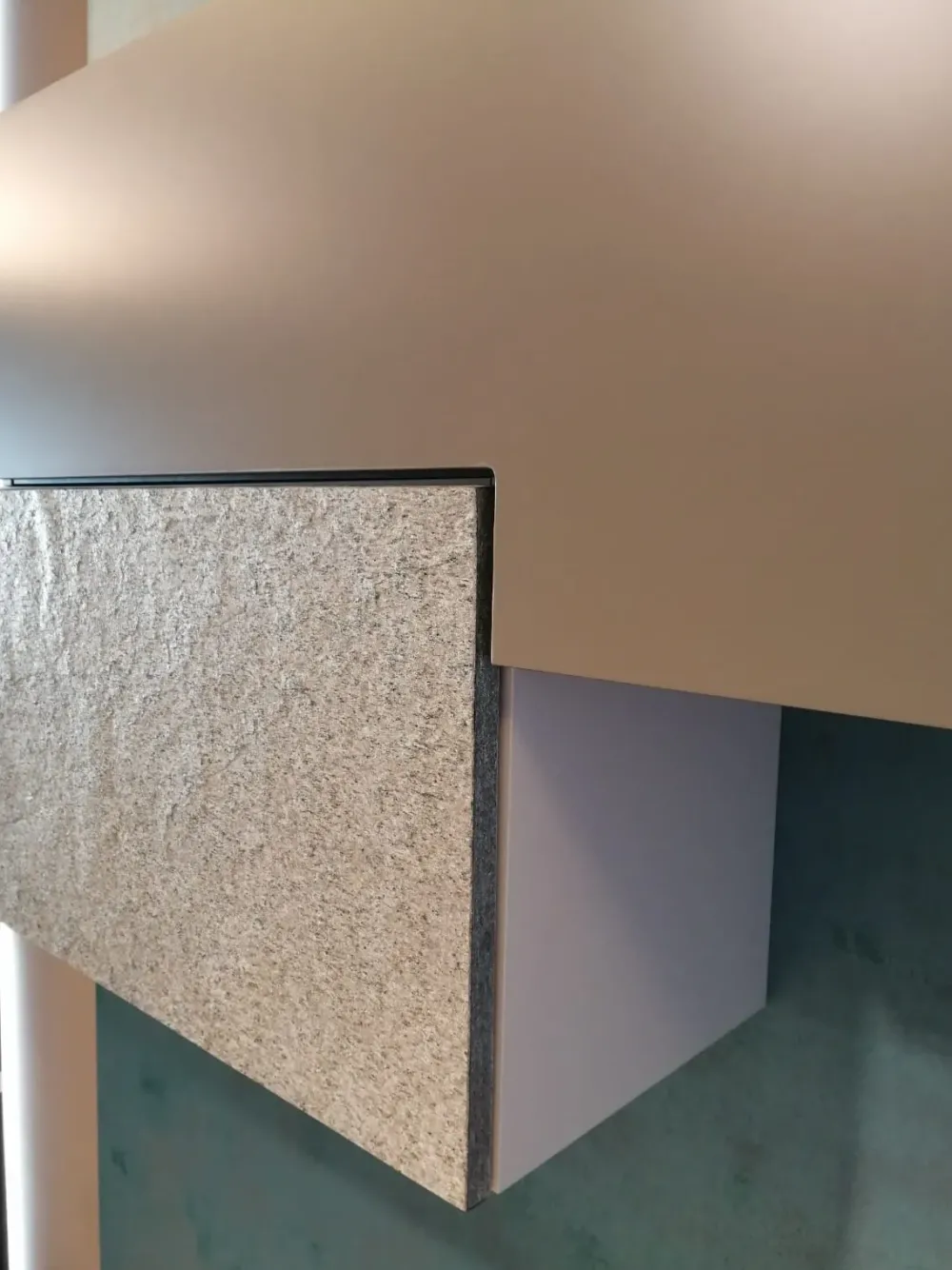 Parete attrezzata componibile come da disegno in allegato composto da una base da 180 cm, prof 59, h 22 cm appoggiata a terra nella finitura frassino ecrù opaco, mensolone sospeso da 240 – sp. 8 cm in rovere old, e pensili sospesi nelle finiture frassino ecrù opaco, laccato opaco quarzo e anta in pietra argentata.. la misura totale può essere modificata in funzione della disposizione di montaggio dei pensili ..