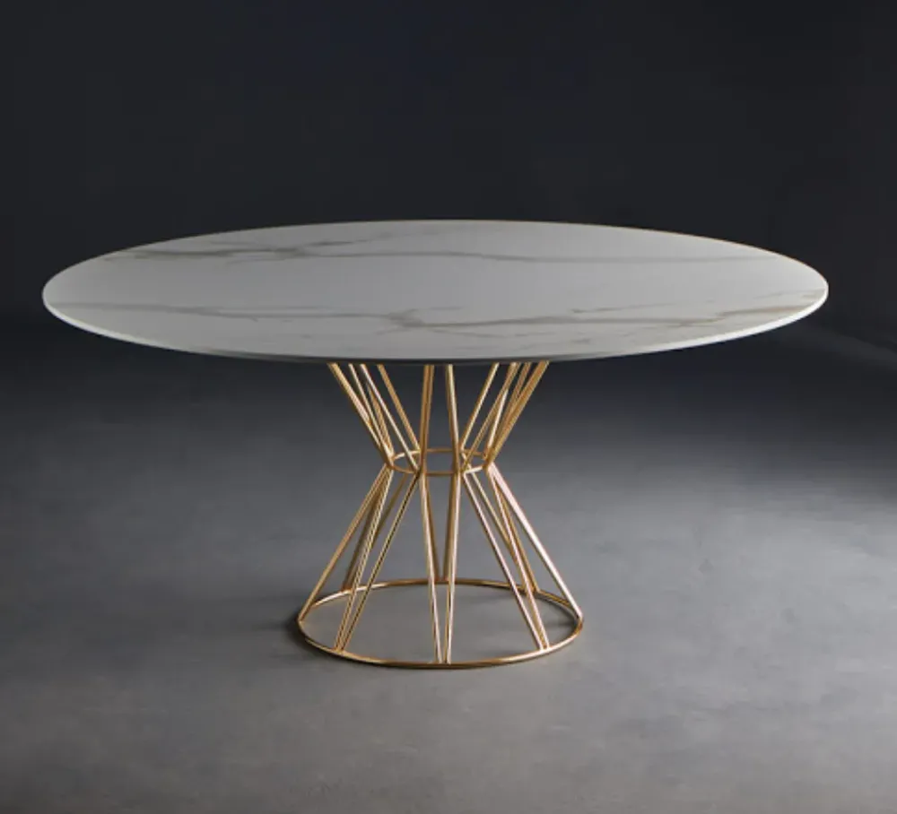 Tavolo con struttura centrale in tondino d’acciaio cromato, colore ottone. Piano in grès porcellanato finitura marmo lucido, colore calacatta oro. Misure: diametro 160.