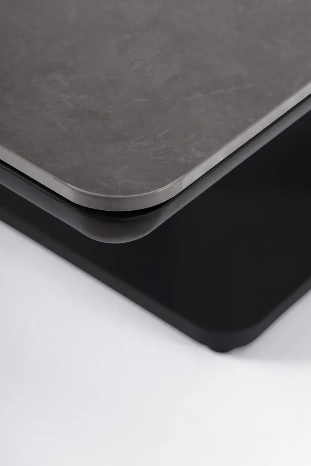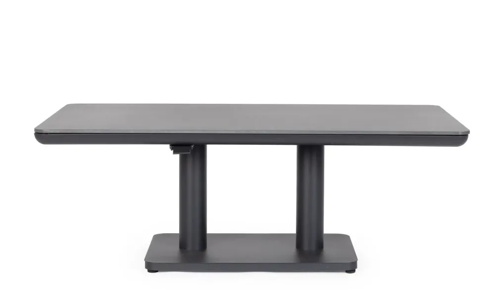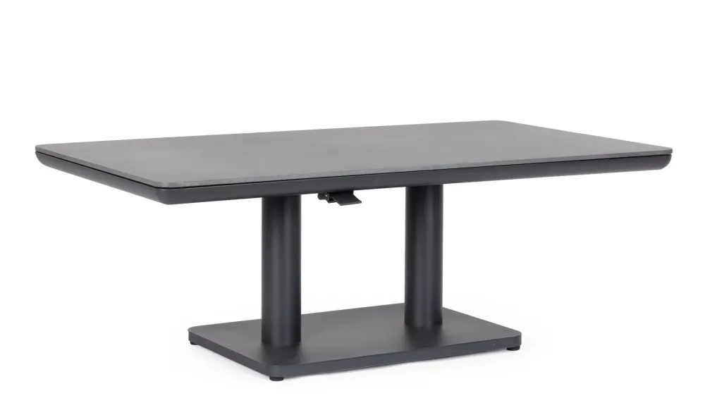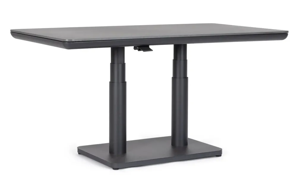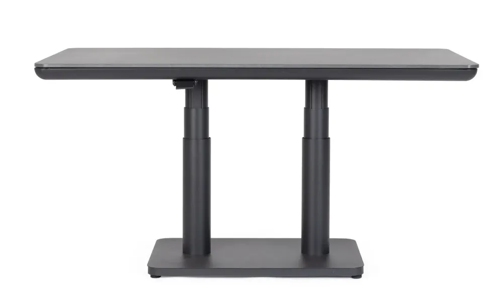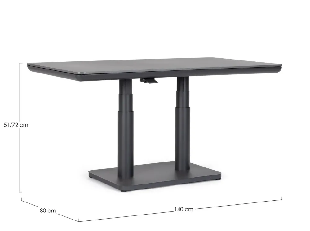 STRUTTURA IN ALLUMINIO VERNICIATA A POLVERE (POLIESTERE). PIANO IN PIETRA SINTERIZZATA (PIETRA NATURALE LAVORATA AD ELEVATE TEMPERATURE)(SPESSORE 11MM). ALTEZZA REGOLABILE IN LIBERA POSIZIONE TRAMITE MANIGLIA. VITERIA IN ACCIAIO INOSSIDABILE. Misure: Lunghezza 140 cm, profondità 80, altezza regolabile da 51 a 72 cm.