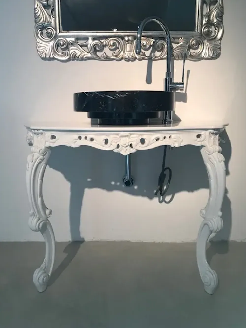 - Di che materiali è fatto il tavolo Well glam?Il tavolo presenta una struttura laccata bianco lucido con un lavabo in pregiato marmo nero marquigna, unendo eleganza e funzionalità.