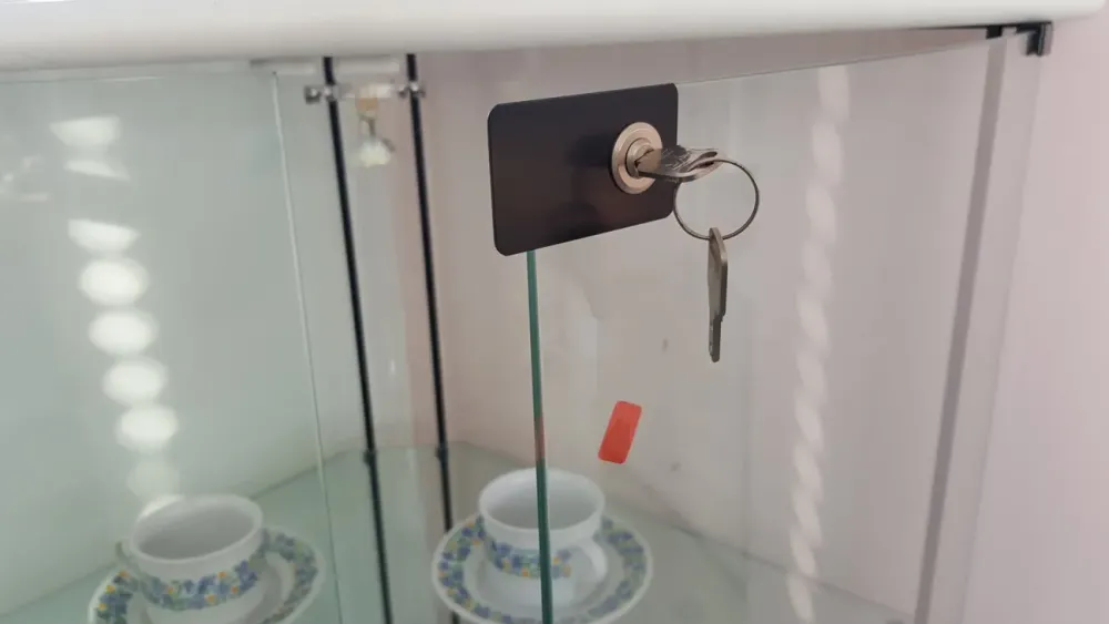 La vetrinetta si compone di due ripiani laccati bianchi che fungono da fondo e da cappello del mobile stesso, da precisare che il ripiano che serve come fondo ha anch’esso una porzione in vetro. Si inseriscono parallelamente ai ripiani laccati internamente 3 ripiani in vetro trasparente anch’essi angolari e stondati sul fronte.