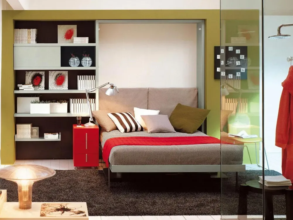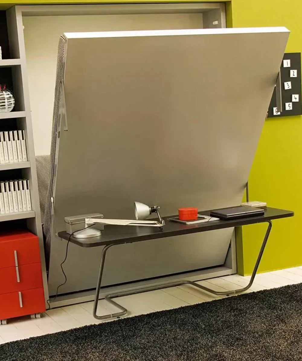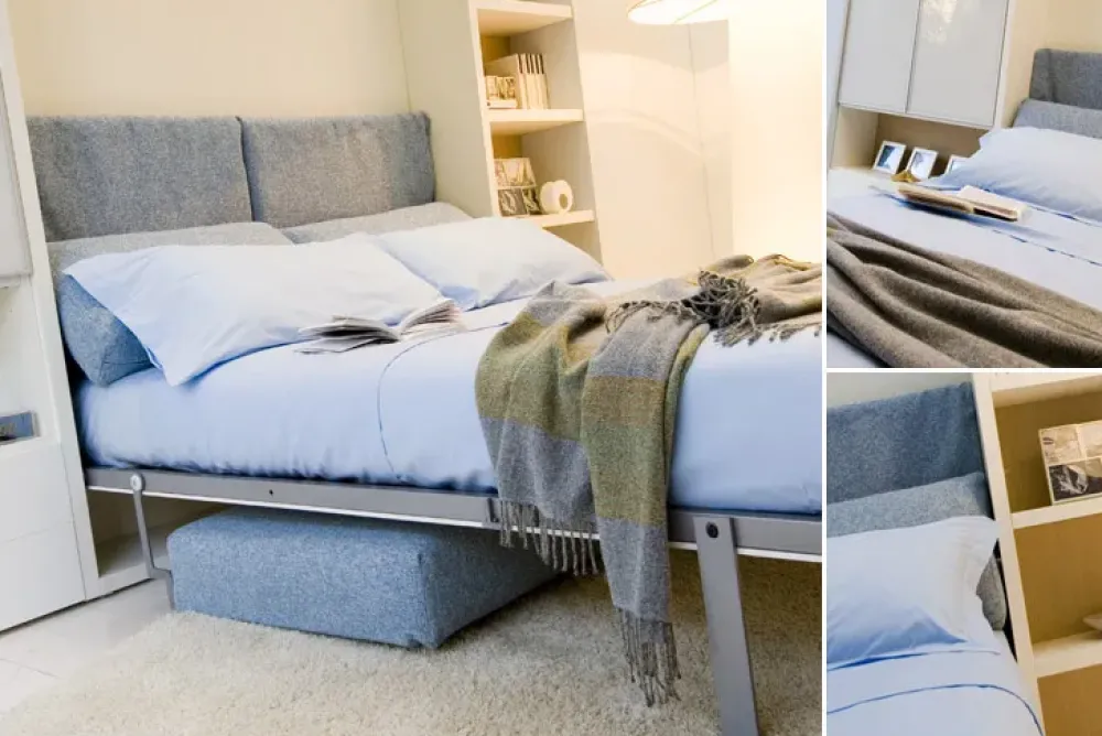 - Letto matrimoniale sempre pronto: apertura verticale rapida e intuitiva, con rete a doghe in legno per un sostegno ottimale. Il letto si abbassa con un semplice gesto, grazie a un sistema di ganci laterali integrati tra fianco e pannello.