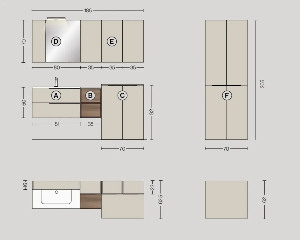 Componibile in diverse soluzioni e disponibile come in foto con colonna lavatrice asciugatrice in sostituzione del pensile con una maggiorazione di 500
