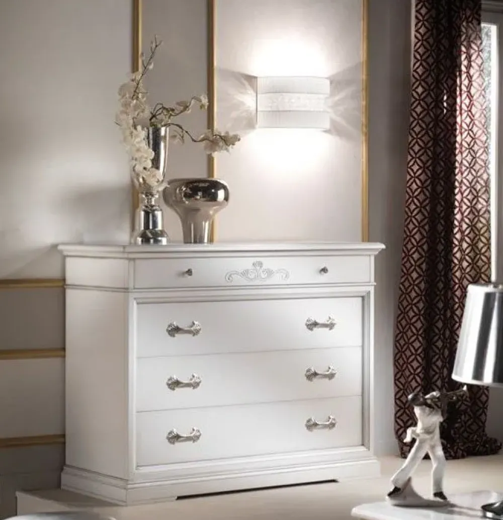 Camera Bamar, in legno massiccio prodotto artigianale in laccato bianco con pattina grigia. L’armadio a due ante scorrevoli a telaio con maniglie ad incasso. Il comò a quattro cassetti presenta un decoro fatto a mano da esperti artisti intagliatori e cassetti con giunture a coda di rondine. I due comodini riprendono le stesse lavorazioni artistiche del comò. Infine si trova in letto traforato intagliato e decorato a mano caratterizzato da linee dolci e design classico ma rivisitato in chiave moderna.