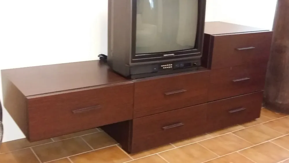 La composizione cassettiera sfalsata in laminato effetto legno dal design moderno, è possibile utilizzarla come mobile porta tv ,come cassettiera da camera oppure mobile ingresso.