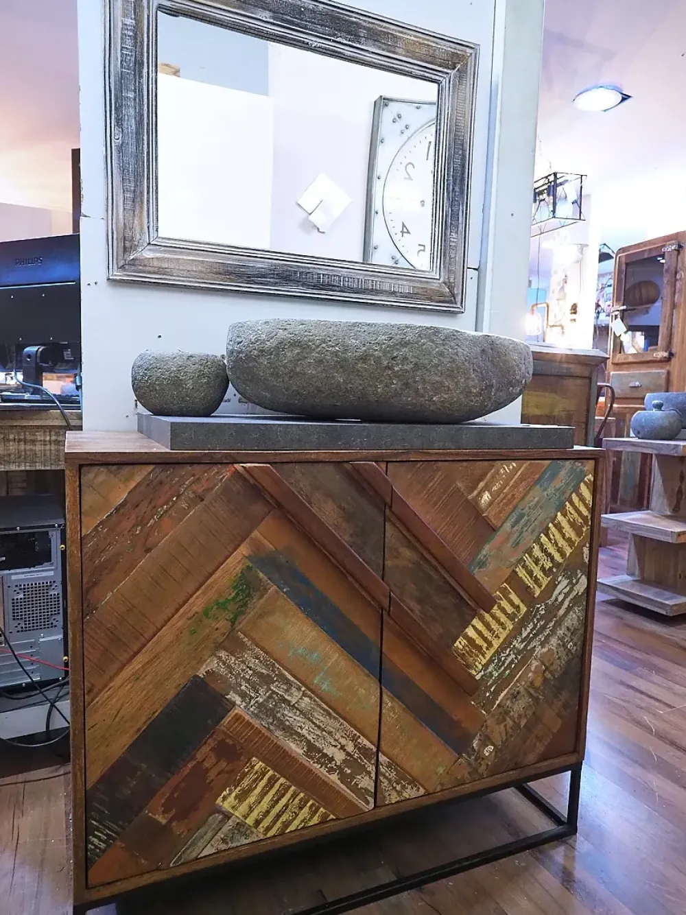 il mobile bagno in offerta industrial e’ realizzato in legno di sessham wood il lavabo in pietra di fiume in offerta ad