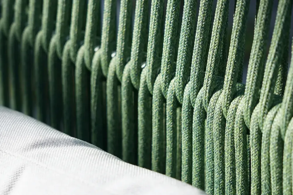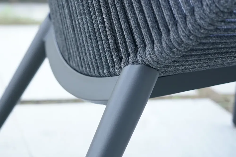 Coordinato con struttura in alluminio e rivestimento in corda acrilica Ø 9 mm, composto da due poltrone, un divano due posti e un tavolino con piano in alluminio.