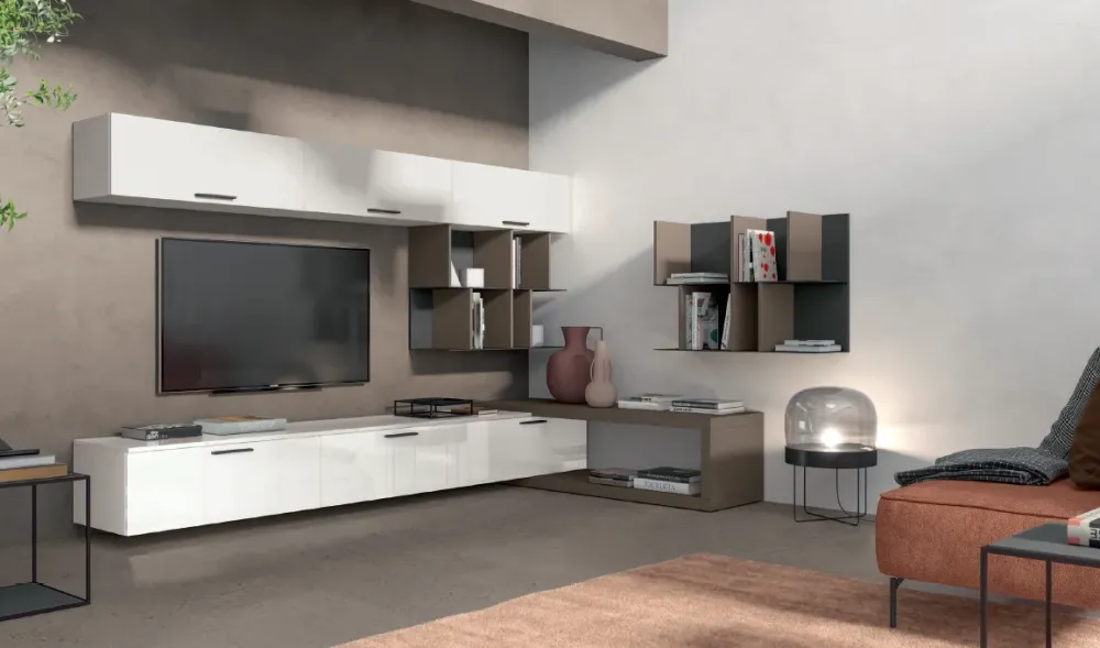 Il soggiorno si compone di vari mobili e oggetti accessori capaci di ultimare lo spazio sfruttando bene ogni angolo ; tra questi deve esserci una parete attrezzata come il modello L109 di Colombini casa presente in foto, studiata per dare vita a un soggiorno dinamico e operativo.